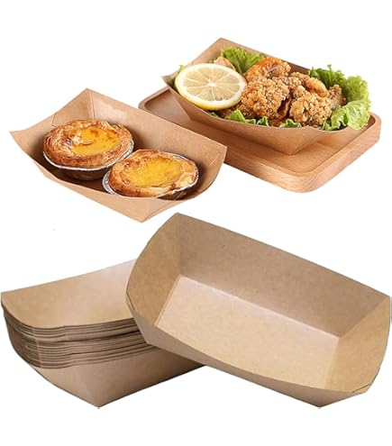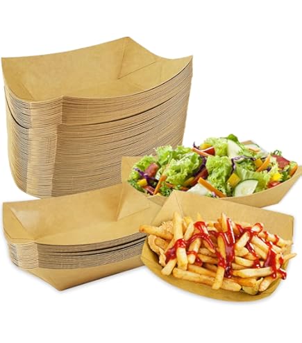 GOMETY Lot de 100 bols en carton kraft pour amuse-bouche, 18,2 x 12,2 x 30 cm, bols à frites, à saucisse au curry, assiettes en carton, pour mariage, Pâques, fête, apéritif Caractéristiques : Les bateaux jetables Fingerfood sont composés à 100 % de matières premières renouvelables et se décomposent beaucoup plus rapidement que les produits en plastique traditionnels. 50 Pièces Plateaux en Carton Kraft, Amuse Gueules, Boîte à Frites, Adaptés aux Frites, Collations, Macarons et Autres Aliments Matériau de haute qualité : les bols à frites sont fabriqués en papier kraft épais de haute qualité, qui est isolé thermiquement et anti-brûlure... Revêtement oléophobe : le revêtement intérieur pour amuse-bouches est résistant à l'huile et à l'eau et empêche les sauces et les trempettes de s'infiltrer Contenu : 100 petits bateaux pour amuse-bouche Ces bateaux jetables sont une alternative écologique et naturelle aux bols en plastique et en carton et sont neutres au goût et conviennent à un usage alimentaire. Caractéristiques : Matériau : papier kraft Quantité : 100 pièces Couleur : marron. Anti-fuite pour la sauce : ces bateaux amuse-bouches sont parfaits pour les aliments servis avec de la sauce grâce à leur sécurité anti-fuite Les adultes peuvent facilement équilibrer les bols à frites avec leurs mains, très stables. Les bols à pommes sont assez durs, sûrs, non toxiques, non blanchis et biodégradables et peuvent être utilisés en toute sécurité en contact direct avec les aliments Bols ronds en carton kraft Assiettes Carton GOMETY Lot De 100 Bols En Carton Kraft Pour Amuse-bouche, 18 Assiette Recyclable Large application : avec des bateaux jetables pour amuse-bouches, parfaits pour servir des entrées et des amuse-gueules à différentes occasions telles que les anniversaires, les pique-niques, les mariages et les réunions de famille