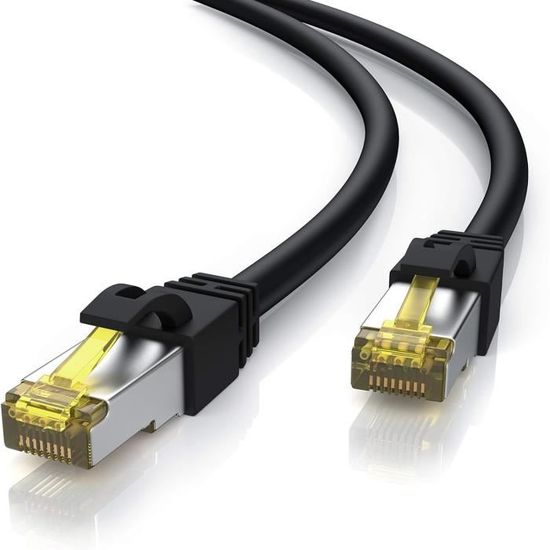 Cable Ethernet 5m,CAT7 Cable RJ45 Blindé Câble Réseau 5ms Haut Débit 10Gbps Cable Wifi Intérieur... PROTECTION OPTIMALE : avec sa robuste gaine extérieure, le câble Primewire CAT 7 premium est le meilleur choix pour les installations extérieures (particuliers ou professionnels). LE CABLE N’EST PAS CONÇU POUR L’ENFOUISSEMENT DIRECT (NOT DIRECT BURIAL). Avec décharge de traction Câble Ethernet blindé Cat 8 de 10 m, câble Rj45 Cat 8 10 m, câble réseau 40 Gbit-s 2000 MHz... Étanche et résistant aux intempéries 7 S/FTP PiMF 10 Gbit/s pour les environnements extérieurs et industriels Avec sa robuste gaine extérieure, le câble Primewire CAT7 est le premier choix pour une utilisation en extérieur. IL est idéal pour les connexions LAN, comme extension qui passe dans le jardin, caméras de détection de mouvement ou de surveillance et il est aussi utilisable alternativement, comme une robuste extension en intérieur. Caractéristiques : Câble extérieur CAT 7 avec une robuste gaine extérieure en PE Les contacts plaqués or des fiches RJ45, résistants à la corrosion et avec un cycle d’accouplement très élevés, assurent une meilleure transmission des signaux. Remarque : à l’installation, il est recommandé de faire passer le câble dans des gaines ondulées. Idéal pour toutes extensions en extérieur, exemple : pour installer des caméras de surveillance et en intérieur (TV, Playstation, Xbox, PC, Wii, routeur). Sans halogène et résistant à l'huile Câble Ethernet Cat 7 5m Câble Ethernet Blindé Extérieur CAT 7 IP66 - S/FTP Pimf Cable Ethernet Cat 7 Contenu de la livraison : câble réseau blindé extérieur Cat 7 avec connecteurs RJ45 Primewire. Résistance à l'abrasion, Une protection anti-pliage L’épaisse gaine extérieure du câble Primewire est résistante aux rayons UV, à l'huile, à l'abrasion et à l'eau (étanche). Hydrofuge/étanche, résistant aux rayons UV, à l'huile et à l'abrasion., Sans halogène. Primewire - 5 m Ethernet cable shielded outdoor CAT 7 IP66 Il offre les plus hauts débits de transfert de données allant jusqu'à 10 Gigabit en combinaison avec un double blindage feuillard métallique des paires torsadées et blindage global en maille métallique pour une haute protection contre les interférences électromagnétiques, gaine en pvc et une deuxième gaine extérieure en polyéthylène. LE CABLE N’EST PAS CONÇU POUR L'ENFOUISSEMENT DIRECT (NOT DIRECT BURIAL)., Couleur : noir.