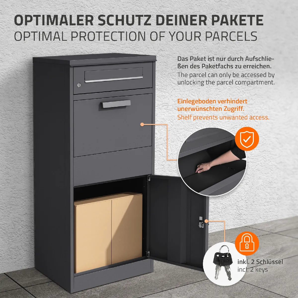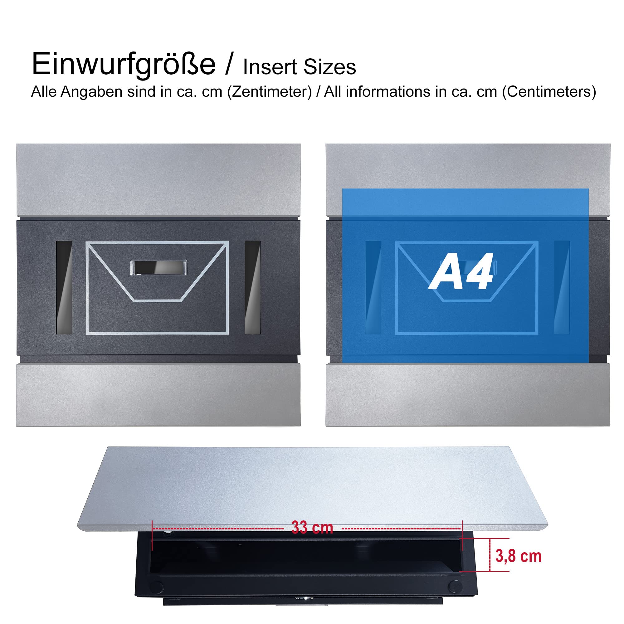 Livré équipé d'un verrou intelligent sans clé par mot de passe et d'une charnière interne pour une double protection antivol. Dotée de 4 trous pré-percés sur le panneau arrière, notre boîte à colis est facile à installer sur un mur ou au sol en seulement 3 étapes simples Surface : lisse, revêtement en poudre VERROUILLABLE : Serrure avec cylindre de fermeture, quatre clés sont incluses. Large clapet d'introduction Boîte Aux Lettres Moderne Anthracite Compartiment À Journaux 2 Clés... Montage Le montage est simple : il suffit d'utiliser quatre entretoises et quatre vis avec chevilles sur une surface murale plane. Boîte aux lettres moderne et élégante au design intemporel avec compartiment à journaux Cette boîte aux lettres élégante en acier galvanisé de haute qualité de couleur anthracite/argent est un véritable accroche-regard que vos voisins vous envieront. La large fente d'insertion est protégée par un rabat étanche à l'eau pour que votre courrier reste propre et sec. Clés Si vous achetez plusieurs boîtes aux lettres de cette série, vous pouvez facilement séparer les clés et les attribuer correctement. Fermeture en douceur : Un pare-chocs intégré pratique permet de fermer le couvercle en douceur. Plaque nominative (LxH) : 74 x 22 Pratique : Avec de grandes ouvertures de vision. Le matériel de montage est fourni sous forme de 4 entretoises, 4 vis et 4 chevilles. TÄGA 2220B Boîte Aux Lettres Design Moderne Avec Compartiment Matériau Matériau : galvanised steel, Couleur : anthracite/argent Mécanisme de fermeture automatique Er eignet sich sowohl für die Innenmontage als auch für die Montage draußen. Dimensions : Convient aux lettres jusqu'au format DIN A4 et C4., Dimensions extérieures : 37 x 37 x 10,5 cm (longueur x largeur x profondeur), dimensions du dépôt : 33 x 3,5 cm (largeur x hauteur), compartiment à journaux : 7,5 x 8,6 x 37 (largeur x hauteur x longueur). Boîte aux lettres design moderne gris anthracite mat avec compartiment Verrouillable et numéroté La serrure cylindrique est numérotée, tout comme les deux clés fournies. Toutes les indications sont en millimètres (mm) env.