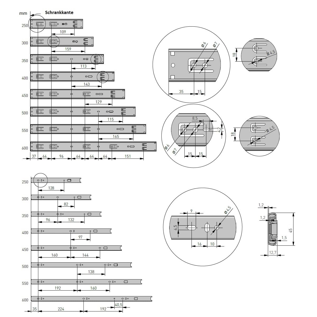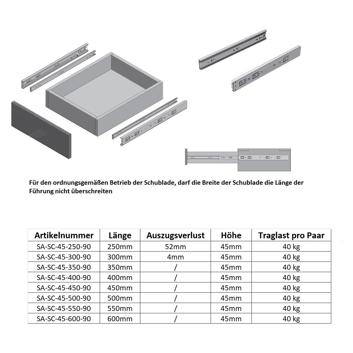 Les glissières complètes ont toutes une hauteur de 45 mm et disposent d'un guidage de cage à billes avec billes en acier trempé pour un comportement optimal - Le retrait en douceur (Soft Close) assure que le tiroir est rétracté doucement, silencieusement et lentement et empêche ainsi un claquement fort, ce qui peut entraîner des dommages après un certain temps Caractéristiques techniques et détails de l'article : Matériau : alliage Acier - Couleur : Couleur : noir Acheter MS Beschläge 1 Paire De Glissières Tiroir Avec Système Soft Close Extension Complète 45 Mm Hauteur Rails Automatiques (500 Mm) ? Comparer Chez Largeur totale : 12,7 mm - Hauteur : environ 45 mm Visser la glissière intérieure sur le tiroir Inconnu MS Beschläge 1 paire de glissières de tiroir avec Séparer l'extension intérieure de l'extension extérieure pour le montage Elles sont disponibles par paire et sont disponibles en huit longueurs différentes de 250 mm à 600 mm, ce qui les rend adaptées à différentes applications Les glissières ont également été testées pour une durabilité de plus de 80 000 cycles et la capacité de charge est de 40 kg par paire L'offre et les prix se réfèrent toujours à 1 paire (2 pièces). Glissières de tiroir modernes et de qualité supérieure avec fonction Soft Close confortable en 8 longueurs différentes Guide de cage à billes avec billes en acier trempé pour un comportement optimal - Rail de tiroir séparable - Fonction de déverrouillage du guide pour retirer le tiroir sans outils - Grâce au verrouillage, le tiroir ne tombe pas lorsque le rail est déplié Les glissières complètes sont fabriquées en métal galvanisé... Le prix se réfère toujours à une paire - Toutes les informations et dimensions sont disponibles ci-dessous dans les détails techniques et les dessins techniques. Les longueurs sélectionnables se réfèrent toujours à l'état inséré - Vous avez le choix entre des longueurs de 250 mm à 600 mm Distance minimale entre le tiroir et le corps : 12,7 mm environ