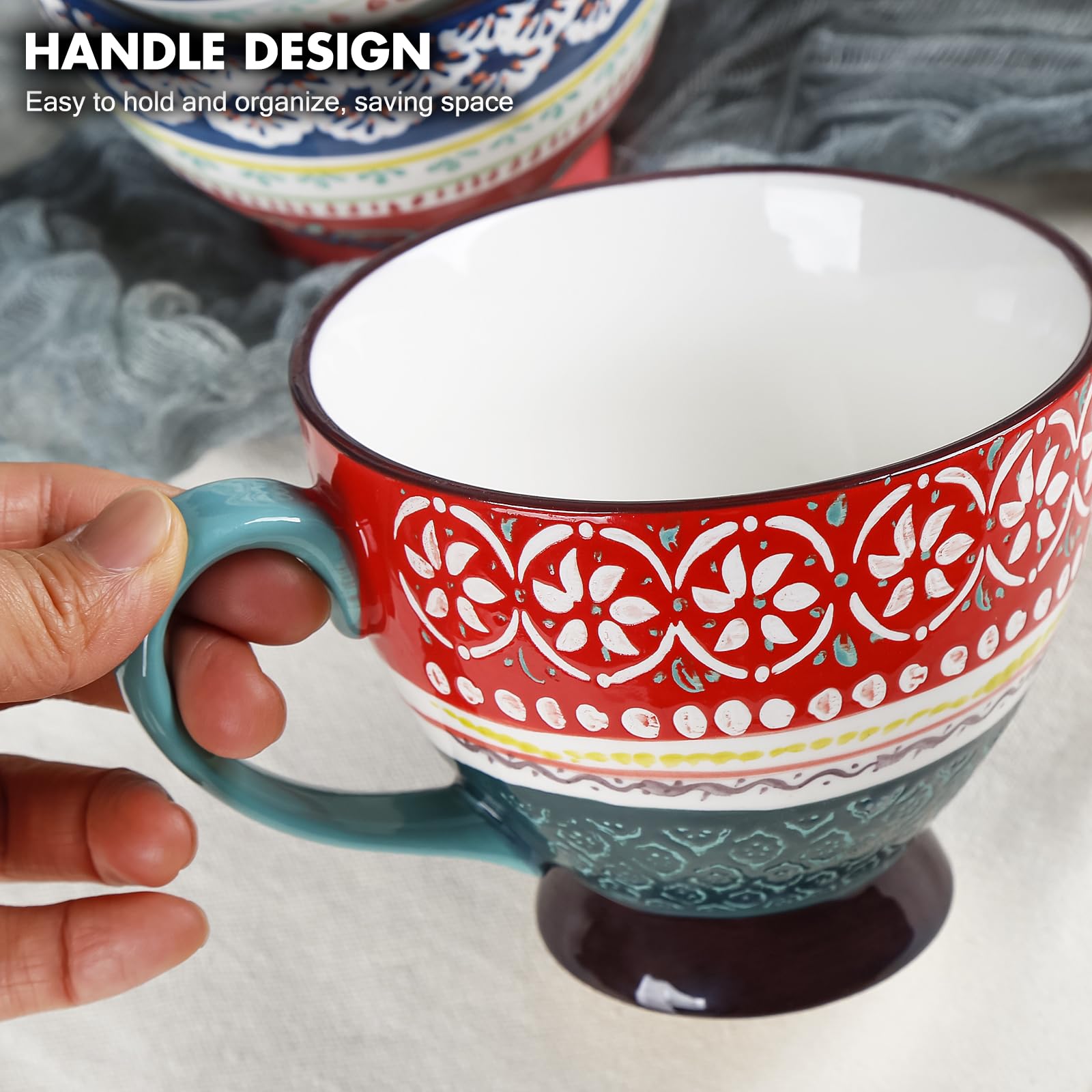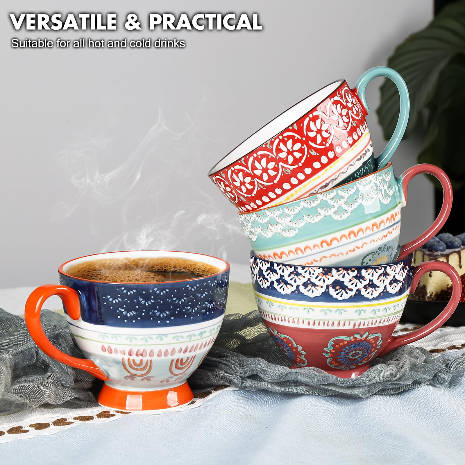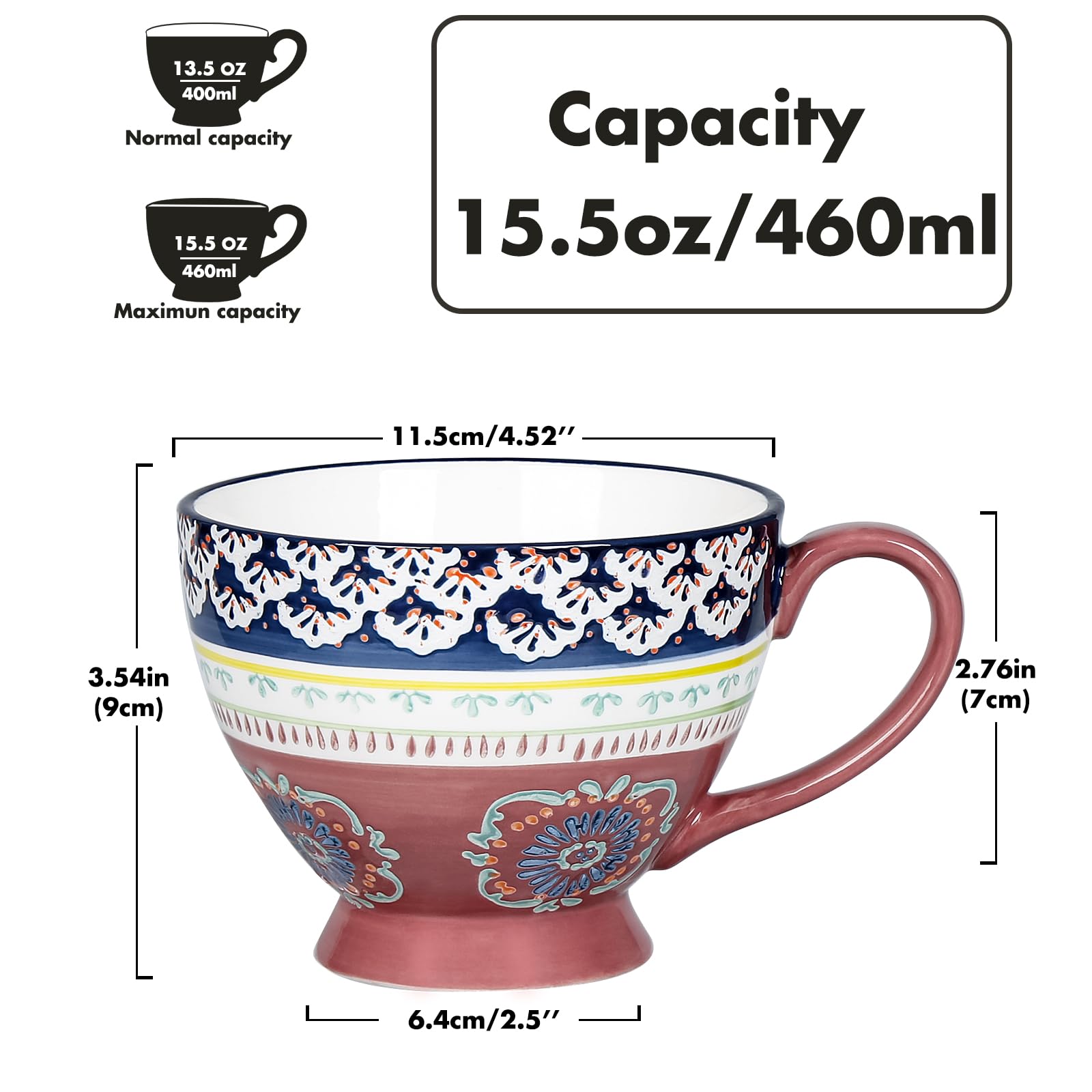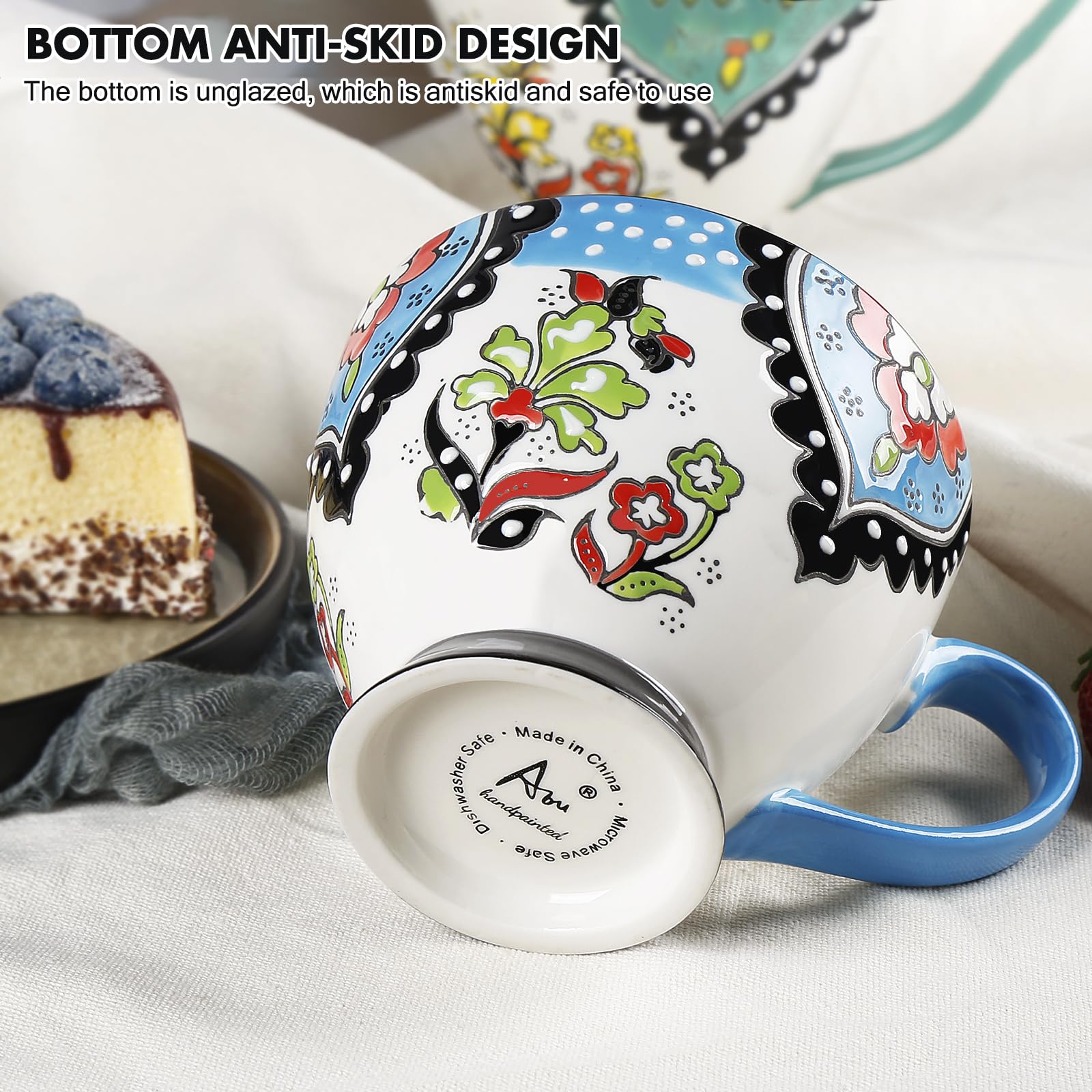 Tasse peinte à la main : chaque tasse est fabriquée avec la technique traditionnelle chinoise de sous-glaçure peinte à la main, et chaque motif est soigneusement peint à la main par un designer de poterie. Surface lisse, motif unique, sans BPA et sans plomb, résistant aux hautes températures. Passe au lave-vaisselle, au micro-ondes, au f 【Facile à tenir】: La conception de la poignée incurvée est confortable et facile à tenir, ce qui permet d'éviter les mains chaudes. 【Beaux cadeaux】: vous pouvez également l'offrir comme cadeau à vous-même, vos amis, copines, mères, épouses, grands-mères, tantes, filles, enseignants, collègues, voisins, collègues. 【Taille et capacité】 : capacité maximale : 450 ml ; capacité normale 400 ml, diamètre de la bouche : 11 cm (4,33 pouces), diamètre de la base : 6,2 cm (2,44 pouces), hauteur de la tasse : 9 cm (3,54 pouces), hauteur de la poignée : 7 cm (2,76 pouces), poids : 395 g / par tasse, il y a quatre tasses dans chaque lot<br/Utilisation multiple : cette tasse de grande capacité est adaptée pour le café, les céréales, le thé, le lait, le jus, les flocons d'avoine, la soupe, la glace, les collations, les salades, etc. Service ET Promesse Des milliers de clients dans le monde attendent d j avec impatience nos produits sains, l gers et pratiques chaque jour. Grande Tasse à Thé 500ml Et 700ml Lot De 4 Grandes Tasses à Café En Porcelaine Avec Anse Pour Mug Café