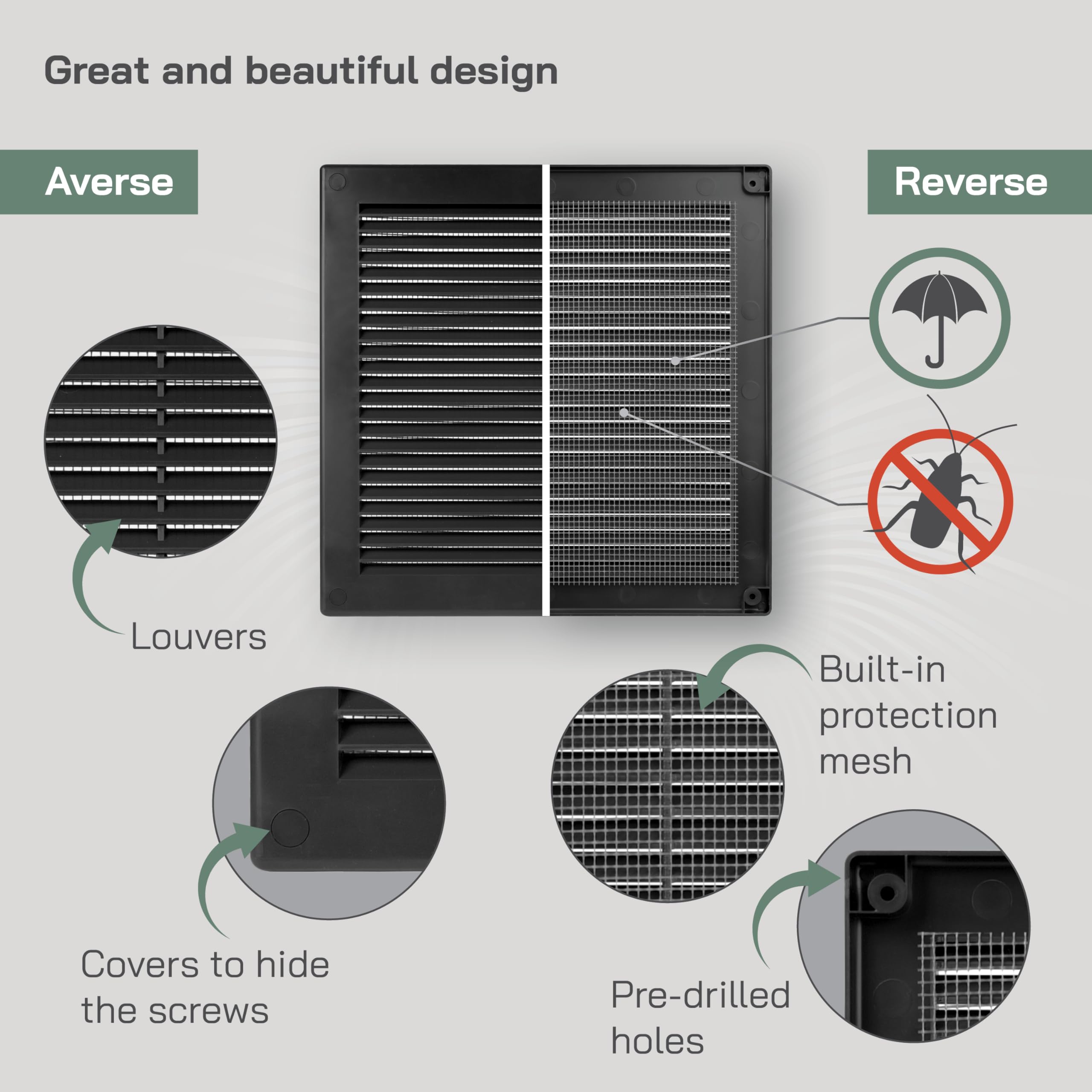 Vent systems 200 x 100 mm - Marron - Grille de ventilation en Dimensions : Avec un diamètre extérieur de 250x250mm, il est idéal pour la ventilation d'échappement et d'admission intérieure.Matériau : Cette grille de retour d'air est fabriquée en acier inoxydable, qui est solide et durable, ce qui en fait un bon choix pour les maisons, les toits ou les hangars. Sa structure et son apparence bien conçues assurent non seulement une ventilation... Grille D'aération Ronde Noire Siphon Inox 250 X 250 Mm: Conception De Qualité Supérieure Grille De Ventilation Noire Vent Systes Housse d'aération en plastique noir de 20,3 x 20,3 c... Achetez Grille de ventilation carrée grillagée 250 x 250 mm noir - VR2525M 35006088 chez Ventigo ✔ Prix compétitifs ✔ Retour gratuit sous 100 jours ✔ Livraison rapide.
