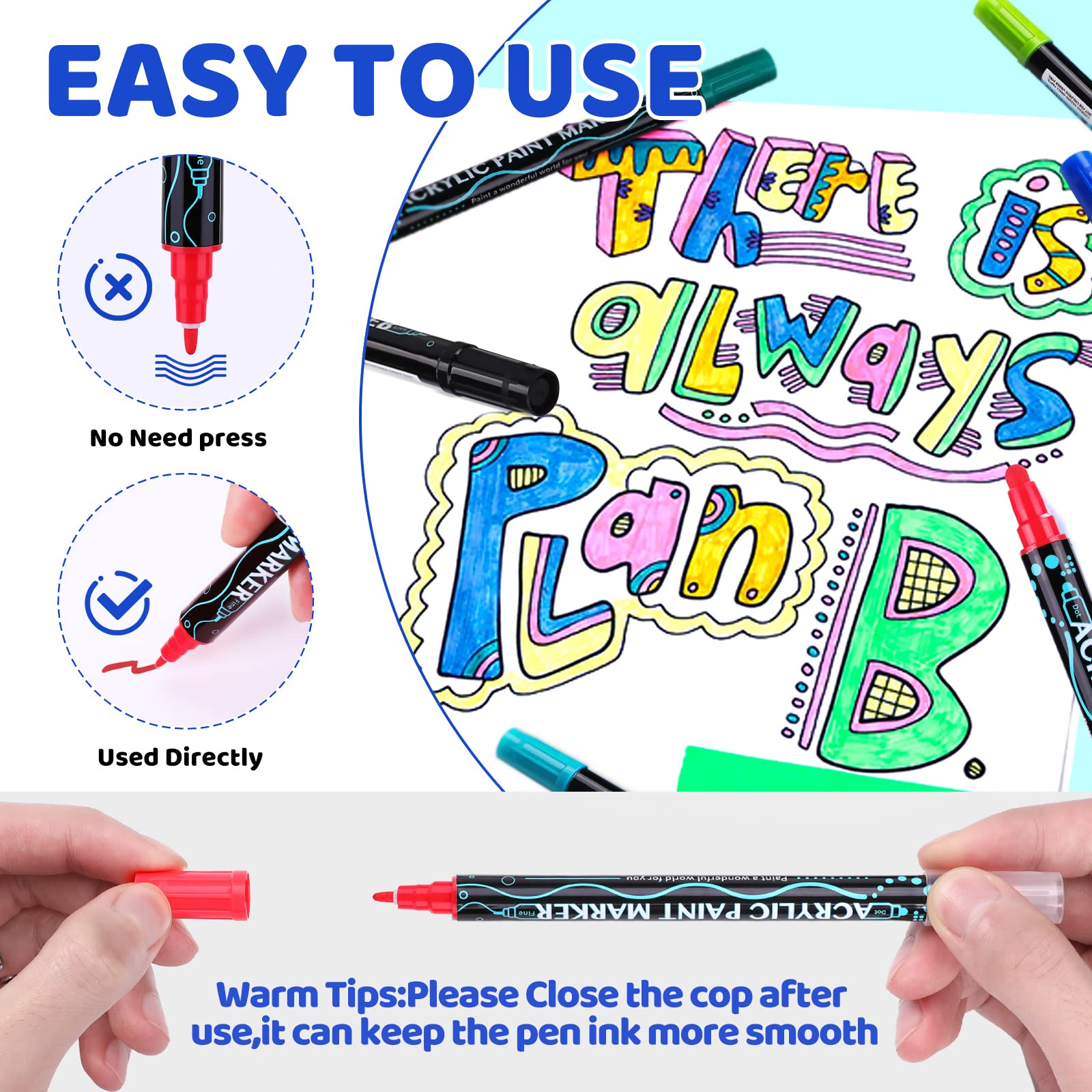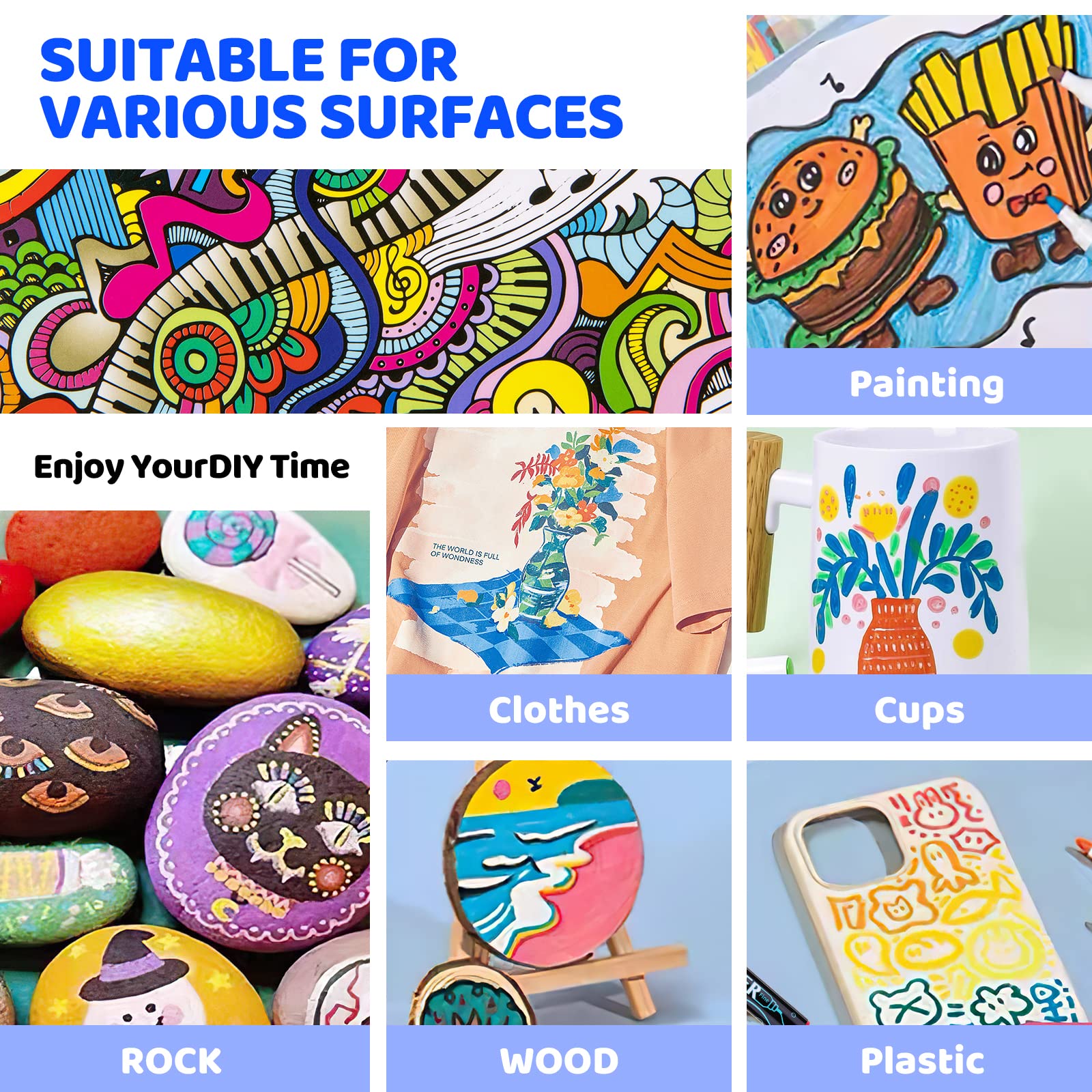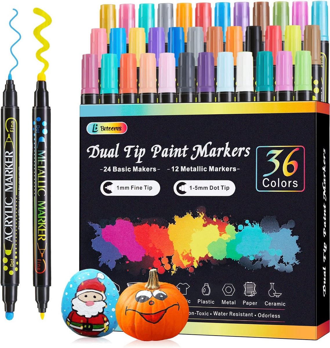 72 marqueurs acryliques de couleurs : le lot de 36 stylos acryliques contient 72 couleurs vives. Idéales pour les projets intérieurs et extérieurs. La pointe conçue avec précision assure une application lisse et contrôlée, donnant à vos œuvres d'art un aspect raffiné et professionnel. 36 couleurs vibrantes, avec une pointe pinceau (1-5mm) pour les grandes surfaces et une pointe fine (1mm) pour les détails. Ça marche sur presque tout : pierre... Ensemble de stylos acryliques et marqueurs de peinture de 13 couleurs... Feutre Acrylique Luvvy Arrtx Stylos De Peinture Acrylique, 36 Couleurs Encre à Base D'Eau Grande Recharge Marqueurs Acryliques Pour Peinture Sur Roche, Bricolage, Verre, Bois, Marqueurs D'Art Pour Enfants Et Adultes Touli Art Feutre Acrylique Que ce soit pour les projets de bricolage, les peintures sur papier, toile ou bois, nos marqueurs offrent une pigmentation intense et une excellente opacité. WuGU Lot de 24 arqueur Acrylique, 48 Couleurs Feutre arqueur Peinture Plus de décoloration ni de rayures Une fois séchées, les couleurs sont résistantes à l'eau et durables, ce qui permet à vos créations de durer dans le temps. Excellent cadeau pour les créatifs : que ce soit pour un anniversaire, Pâques, Halloween, Noël, la Saint-Valentin, Thanksgiving, le Nouvel An ou toute autre occasion spéciale, ces marqueurs sont le cadeau parfait pour encourager la créativité et l'expression artistique