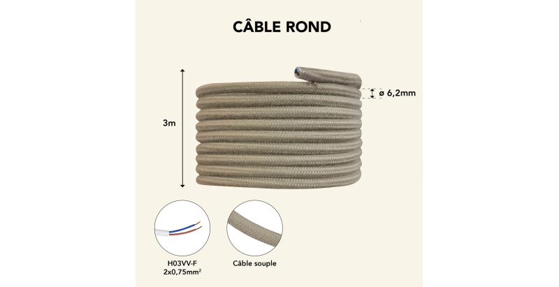 câbles recouverts de tissu textile est parfait pour la réalisations de lustres, lampes ou Pendel de style vintage/rétro. Câbles électriques colorés – personnalisez votre lumière avec style Vous cherchez un Câble électrique coloré pour créer une lampe originale ? Vous voulez rénover un abat-jour, une suspension ou un lustre en ne remplaçant que le fil ? Avec Creative Cables, vous pouvez choisir parmi plus de 250 modèles de câbles en tissu, parfaits pour chaque projet d’éclairage décoratif. Tous... Une texture qui rappelle la nature, la simplicité, réinventée pour laisser place à votre imagination. Cable électrique Textile Couleur LaMorell LightDesign - Câble Électrique Rond Recouvert En Tissu Coton Fil En Tissu Made in Italy, produit conforme à toutes les normes italiennes et européennes Amarcords - Câble électrique Textile Couleur CANVAS MARRON, Rond, Lin, 1 Mètre, à 2 Brins 2x0,75 - Fil Vintage En Tissu Coloré, Pour Lampes, Lustres, Appliques... LaMorell LightDesign - Câble Électrique Rond Recouvert En Tissu Vert Sauge Lm61 15mt 2x0 75 90168031 Diamètre : environ 6,2 mm Grâce au revêtement en tricot brut chaque votre création sera unique.