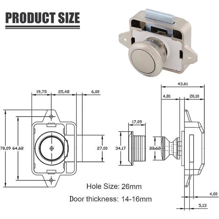 Matériaux de haute qualité: Nos serrures à bouton sont fabriquées en alliage de zinc de haute qualité, finement plaqué, surface lisse et sans texture, durable, l'écrou est intégralement moulé par injection, la résistance du filetage est élevée et il n'est pas facile à casser. Installation simple: Il vous suffit d'utiliser les vis que nous fournissons pour installer sur différents tiroirs et portes avec un diamètre de trou de 26 mm et une épaisseur de 14-16 mm. Large application: Nos serrures à bouton d'armoire sont particulièrement adaptées aux camping-cars et yachts, ce qui peut résoudre efficacement le problème des portes de maison lâches lors du déplacement, et peut également être largement utilisée dans divers tiroirs, armoires, placards et bureaux. Avis clients · Facilité d'utilisation (4,7/5) · Rapport qualité / prix (4,4/5) · Performance (4,5/5) · Simplicité d'entretien (4,2/5 BOUTON POUSSOIR SERRURE à Loquet Armoire Porte Camping-Car Caravane Verrou EUR 7,32 - FR · Remboursement pendant 3 ans de votre achat sous forme d'avoir · Prise... Bouton Poussoir Loquet Sans Clé Chiave Universale Per Serrature Serrure à Bouton Poussoir 2 Pièces - Sans Clé - Pour Porte 15-18mm - Camping-car, Yacht, Meuble (Marron) Serratura Porta Bouton Poussoir Camping Car Bouton Poussoir Loquet 2 Pièces Serrure de Porte Meuble Fermoir