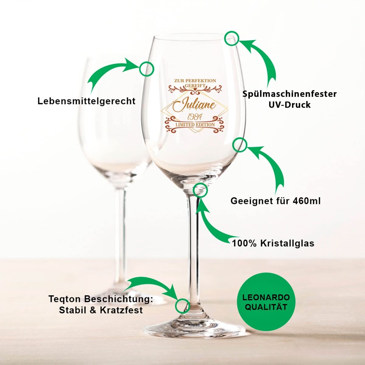 Nos verres sont expédiés en toute sécurité dans un emballage cadeau élégant et robuste. Bord en verre (B) 65 mm., Hauteur totale : 226 mm., Capacité maximale : 460 ml. Gravure : verres à vin élégants avec gravure - Verre de qualité avec impression UV de qualité supérieure. Rendez votre anniversaire, fiançailles, mariage ou Saint-Valentin très spécial avec ce verre à vin conçu avec soin. Motifs chaleureux pour elle et lui. Chacun de nos verres à vin provient de la maison traditionnelle Leonardo, qui avec son nom est clair et fin. La hauteur totale du verre est de 226 mm et la capacité maximale est de 460 ml Avec leur verre transparent et leur design élégant, ces verres sont le cadeau parfait pour toutes les occasions. Dimensions : les dimensions de la coupelle sont conformes à la norme (l x H) : 85 x 118 mm, bord en verre (l) : 65 mm. Surprenez votre partenaire et votre famille avec les designs personnalisés et offrez un cadeau inoubliable Principaux points forts · Marque. GRAVURZEILE · Matériau. Verre · Couleur. Daily Uv · Capacité. 460 Millilitres · Caractéristique spéciale. Robuste · Style. vintage Verres de qualité de la maison traditionnelle Leonardo. Verre Teqton de qualité supérieure - Robuste et résistant aux chocs. GRAVURZEILE Leonardo Verre à Vin Avec Impression UV – Design GRAVURZEILE Briquet personnalisé avec texte et photo - Impression UV de GRAVURZEILE Flûtes à champagne Leonardo avec gravure du nom et de la... Cadeau parfait pour un anniversaire, la fête des mères, la fête des pères, la Saint-Valentin, un mariage ou Noël. Verre de cœur - Cadeaux imprimés pour vos proches préférés. Grâce à la formule innovante TEQTON High-Tech particulièrement robuste, résistante aux chocs et passe au lave-vaisselle Si vous avez encore des questions sur nos produits ou si une livraison ne correspond pas à vos souhaits, nous sommes à votre disposition par téléphone et par e-mail avec conseils et actions Idéal pour les vins rouges et blancs. Dimensions : Dimensions : 85 x 118 mm Si vous êtes à la recherche d'un cadeau fantaisie pour les buveurs de vin, jetez un coup d'œil à nos verres à vin imprimés. 100 % Leonardo - Verre de qualité avec impression UV de qualité supérieure. Nous vous proposons un choix varié d