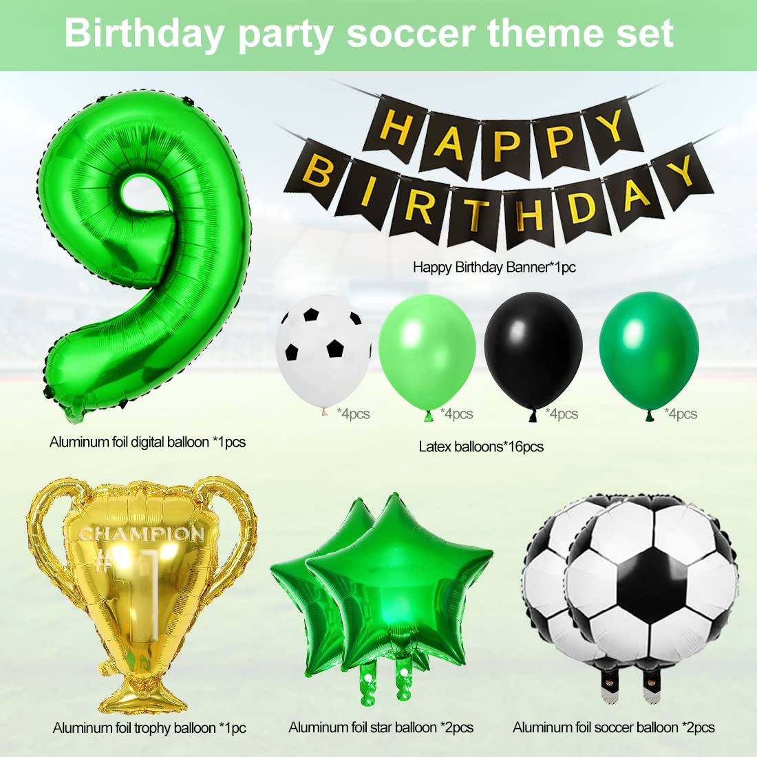 Un nombre suffisant de decoration anniversaire ballon de foot vous permet de décorer une fête unique et de rendre votre espace plein de vitalité et de joie. Les ballon foot aluminium peuvent être décorés dans les cours, les jardins, les plafonds, les fenêtres, les porches et partout où vous le souhaitez. Deco Foot Kit Anniversaire Football - Kit Goûter Mondial De Foot Enfants Vaisselle Anniversaire Football Tous ceux qui aiment jouer au football seront impressionnés par ces décorations après avoir vu ce decoration football anniversaire. Les décoration de fête de football vous aideront à créer une atmosphère de fête forte et à ajouter plus de plaisir à vos activités. Que vous regardiez le match à la maison avec des amis, que vous célébriez un championnat lors d'une fête d'anniversaire ou avec des coéquipiers, nos décoration anniversaire football rendront votre fête plus charmante ! Nos kit décoration anniversaire foot conviennent à une variété d'occasions, telles que les anniversaires d'enfants, les soirées à thème, les baby showers, les cérémonies de remise de diplômes d'enfants, les matchs de football, etc. Ballon hélium Anniversaire ballon de Foot Vous pouvez les combiner dans différentes décorations de fête selon différents besoins pour ajouter des décorations plus amusantes et attrayantes à la fête. 【Large application】Les ballon de foot anniversaire sont des accessoires de fête idéaux et peuvent être utilisés pour les fêtes d'anniversaire, les matchs de football, les décorations sportives, les décorations de festival, les décorations de maternelle, les soirées à thème et bien d'autres occasions. Avertissement De Sûreté NO Ballon Football Anniversaire, Décoration 4 Ans Anniversaire Enfants Ballon, Kit Anniversaire... Search faster with PicClick Visual Search. 【Matériaux de haute qualité】Les ballons anniversaire foot sont fabriqués en aluminium de haute qualité, avec des couleurs vives, pas faciles à casser et à fuir, durables et réutilisables. Spécifications : Matériau : feuille d'aluminium Couleur : comme indiqué sur l'image Taille : comme indiqué sur l'image Contenu de la livraison : 1 x ballon numéro vert 1 x ballon trophée 2 x ballon anniversaire football 2 x ballons étoiles vertes 2 x ballon étoile noires Conseils utiles : 1., Les ballons ne doivent pas être trop remplis lorsqu'ils sont gonflés., Gonflez à 80%-90%., 2., N'exposez pas les ballons gonflés au soleil, ne les frottez pas excessivement et ne touchez pas d'objets tranchants., 3., Les enfants de moins de trois ans doivent utiliser les ballons sous la surveillance d'un adulte., 4., Mesure manuelle, veuillez prévoir une légère erreur de taille, merci de votre compréhension., 5., Les couleurs peuvent varier légèrement en raison des différents affichages sur l'écran.
