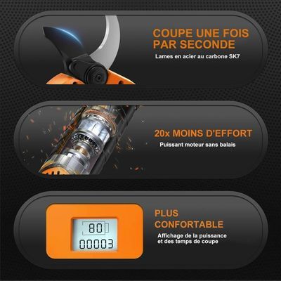 Garantie d'un an : nous offrons un service de garantie d'un an après l'achat. Coupe Branche Sécateur Électrique Sans Fil, 50mm Secateur Electrique Professionnel Secateur Electrique Avec 2 6000mah Batteries Led Ecran Secateur A Batterie Po 96650244 Secateur électrique 40 Mm Lames SK7 de qualité supérieure : nos sécateurs électriques sont équipés de lames en acier au carbone SK7 de qualité supérieure avec revêtement en téflon. Caractéristiques techniques : Nom : sécateur électrique Puissance de crête : 1280 W. Moteur sans balais 800W ultra puissant, lame en acier SK7 qui coupe net les branches jusqu'à 40mm d'épaisseur. Deux batteries Li-Ion 21V/2000mAh incluses pour... Si vous avez des questions ou des problèmes de qualité, vous pouvez nous contacter à tout moment. Moteur sans balais puissant : notre sécateur sans fil utilise un moteur en cuivre sans balais amélioré avec des fils de cuivre de 30 % plus épais à l'intérieur et une puissance de sortie allant jusqu'à 1280 W. Augmentez la durée de vie des lames en ajustant la lame grâce au nouveau système contrôlant les réglages de la lame sur la contre-lame Coupe progressive avec 2 ouvertures de lame prédéfinies (27 mm et 40 mm), ce modèle vous permet également d'ajuster l'ouverture de la lame à la capacité de coupe souhaitée, maximisant ainsi l... Chaque lame garantit environ 150 000 coupes avec des interfaces propres qui n'endommagent pas l'écorce des arbres et ne laissent aucun résidu, de sorte que les arbres restent esthétiquement agréables. Tension de la batterie : 21 V CC. Sécateur Electrique Sans Fil, Sécateur Electrique Professionnel de 30-40 mm Avec Ecran LCD, 2 * 2000 mAh 21V Batteries, Remplaçables Lames SK7, Sécateur Electrique pour Jardinage, Verger, Ferme Épaisseur de coupe de 0 à 40 mm : ce coupe-branches sans fil dispose d'un diamètre de coupe maximal de 40 mm. Les accessoires complets offrent à la fois praticité et sécurité, ce qui vous permet de commencer à travailler immédiatement. Kit de coupe complet : ce kit de coupe-branches électrique contient 1 sécateur électrique, 1 meule, 3 lames interchangeables, 2 batteries de 2000 mAh, 1 chargeur, 1 paire de gants et des lunettes de protection. Batterie durable avec design de sécurité : ce coupe-branches sans fil est équipé de deux batteries rechargeables haute performance de 2000 mAh qui, en cas d'utilisation alternative, permettent une durée d'utilisation continue de 6 à 8 heures – suffisant pour la plupart des travaux de coupe. En outre, les batteries disposent de quatre fonctions de sécurité : protection contre les surintensités, les surtensions, les surchauffes et la charge et la décharge pour assurer une utilisation sûre.