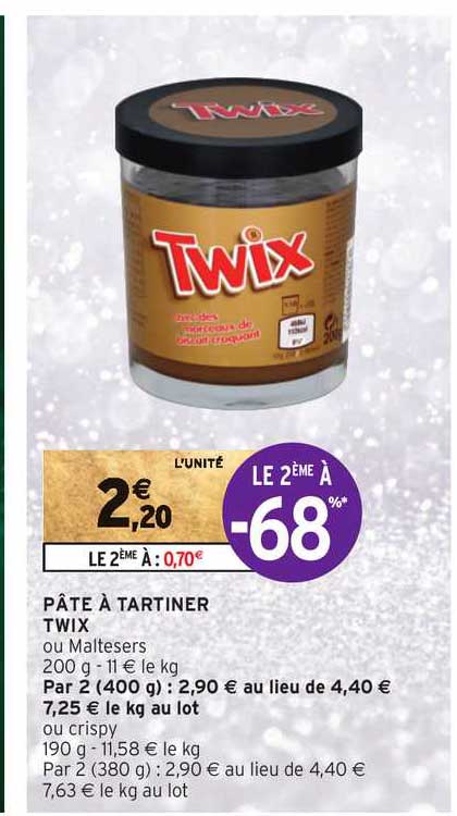 Onctueuse et crémeuse, elle est idéal pour le goûter et les petit-déjeuner. Pate à Tartiner Pâte à Tartiner Crunchy Et Pièces De Biscuit TWIX 200g Lotus Biscoff Origine : Etats Unis d'Amérique , Pot en verre. Promo Pâte à Tartiner Twix Le 2ème à -68% chez Intermarché Hyper... Twix, Bounty et Maltesers arrivent en pâte à tartiner Vous êtes un inconditionnel des barres chocolatées Twix et Bounty ? Vous ne pouvez résister à la douceur des Maltesers ? Le groupe de confiserie Mars Incorporated Ingrédients : Sucre, huiles végétales (colza, palme), morceaux de biscuit (10%) (amidon de pomme de terre, farine de maïs, sucre, huile de palme... Idéal pour les goûters et les petits déjeuners Ingrédients Ingrédients : Sucre, huiles végétales (colza, palme), morceaux de biscuit (10%) (amidon de pomme de terre, farine de maïs, sucre, huile de palme, farine de riz, BEURRE concentré (LAIT), amidon modifié, amidon de tapioca, sirop de glucose-fructose, dextrose, sel, arôme naturel de vanille, poudre à lever : bicarbonate de sodium, vanille Bourbon), poudre de LAIT entier, LACTOSE, cacao maigre en poudre (4%), émulsifiant : lécithines, arômes naturels, sel, NOISETTES.