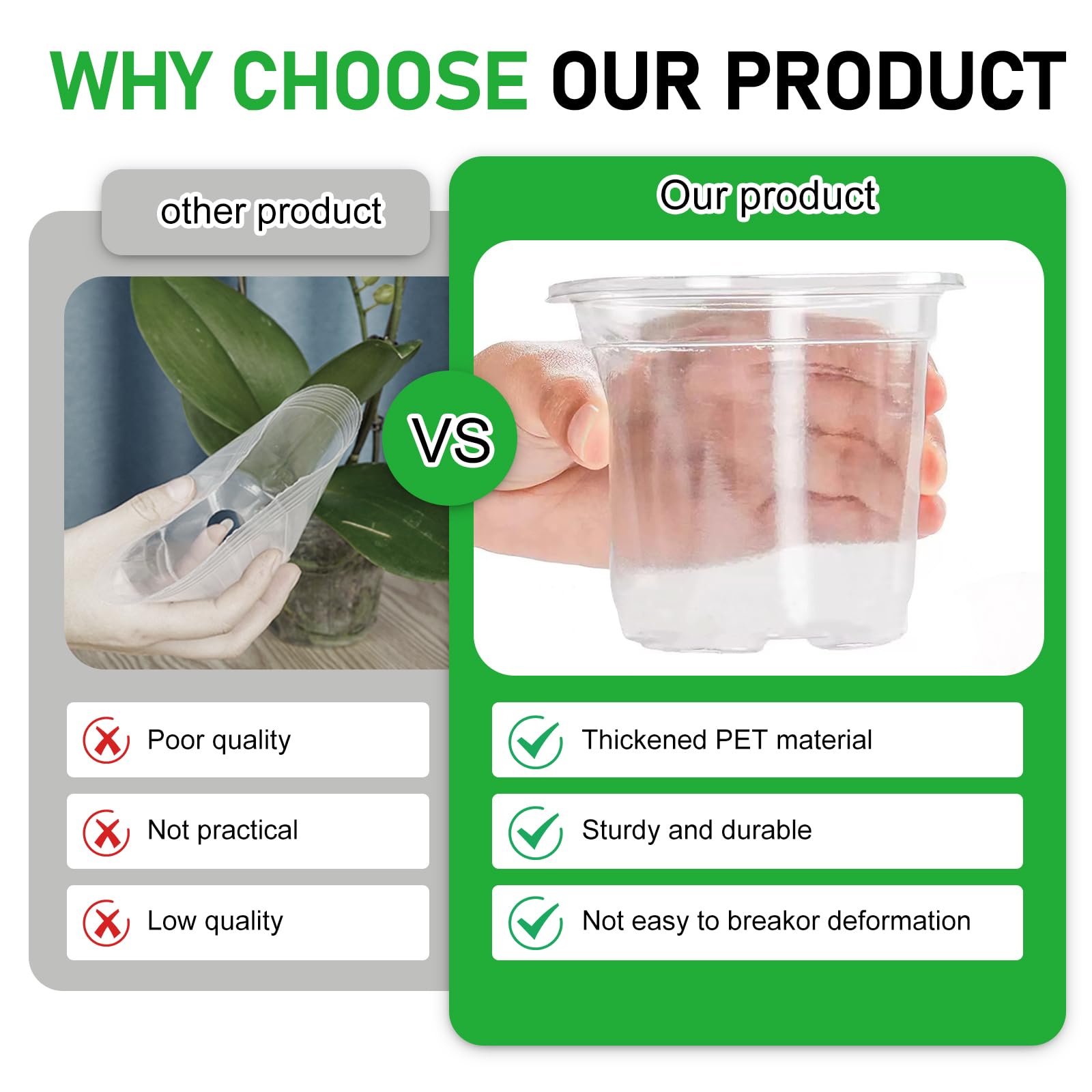 Cadeau idéal : ces pots sont le cadeau parfait pour les amateurs de plantes ! Différentes tailles : les pots d'intérieur sont disponibles en 3 tailles différentes (10/14/16 cm), avec deux pots de chaque taille, soit un total de 6 pots transparents. Il est facile à nettoyer et réutilisable. Que vos orchidées, plantes grasses, cactus ou autres plantes en pot soient petites ou grandes, vous trouverez la taille parfaite pour offrir à vos plantes un environnement de croissance optimal ! Décorez votre rebord de fenêtre, votre bureau ou votre espace de travail : ajoutez une touche de vie à chaque pièce ! Il est parfait pour décorer votre chambre, votre jardin, votre balcon et votre bureau. Pots de fleurs transparents de 17 cm avec trous et soucoupes pour orchidée tropicale, Anthurium... Bienvenue dans la boutique Griwuut ! Elles sont idéales pour les amoureux des fleurs., Conseils d'utilisation : 1., en raison de la diversité des écrans et des effets de lumière, la couleur réelle peut être légèrement différente de la couleur montrée sur l'image., 2., en raison des mesures manuelles, la valeur de la mesure peut être légèrement différente, veuillez comprendre. Ces pots sont fabriqués en plastique durable, résistant aux intempéries et au soleil pendant de nombreuses années, sans devenir cassants. Garronda Pots Horticulture Ronds Transparents Pots pour Culture de Pots transparents : les pots Griwuut se caractérisent par leur design transparent, qui vous permet d'observer le processus de croissance de vos plantes tout au long de leur développement ! Pot Plastique Pots De Culture En Plastique Rigide - Matériel De Jardinage Petit Jardin Exterieur Solides et durables : les pots à orchidées en plastique transparent de haute qualité sont légers et faciles à transporter. Pots à orchidées perforés : les pots sont dotés de nombreux trous de drainage répartis uniformément sur les côtés et le fond, ainsi que sur les côtés. - Le bac à orchidées robuste est parfait pour les plantes grasses, les orchidées, les cactus et les fougères. Verschiedene Größen: Der Pflanzentopf für den Innenbereich enthält 3 verschiedene Größen (10/14/16cm), je zwei Töpfe pro Größe – insgesamt 6 Stück transparente Blumentöpfe Lorsque les racines de la plante ont besoin d'être arrosées, elles sont clairement visibles à travers le bac transparent, tandis que le bac laisse passer la lumière du soleil, ce qui favorise la photosynthèse.