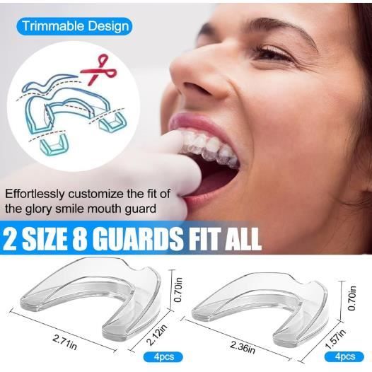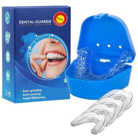 Description du produit Protège-Dents Litlcutie - Pack de 4 pour Hommes et Femmes Protégez Votre Sourire : Avec un protège-dents, vous pouvez réduire efficacement le grincement des dents, la pression dentaire, le bruxisme, la sensibilité, les douleurs à la mâchoire, les maux de tête, et bien plus encore. Dites Adieu au Grincement : Le protège-dents aide à prévenir le grincement et le serrage des dents, détend les muscles de la mâchoire et aide à réduire la douleur dentaire et autres inconforts. Le meilleur protège-dents pour le grincement des dents en 2025 Protège-Dents avec Matériau Sûr : Fabriqué avec un matériau EVA de qualité supérieure, sans BPA, sans latex et sans phtalates, notre protège-dents pour le... Boîte de Protection Pratique : Équipé de 2 étuis de protection pour protège-dents, le design de ventilation sécurisé assure que l'espace de stockage reste sec, garantissant ainsi une meilleure conservation. Goutiere Dent Alignement Gouttiere Dentaire Bruxisme8Pcs,Protecteurs Buccaux, Protege Dent Bruxisme,Gouttiere Pour Dent Sans BPA,Protege Dent Nuit,pour Arrêt - Au Quotidien Protection Gouttiere Spécifications : Grande taille : 6,5 cm x 5,5 cm x 1,7 cm Petite taille : 5,5 cm x 4,5 cm x 1,4 cm Poids de l'article : 115 g Mode d'emploi 1., Plongez le plateau d'empreinte dentaire dans de l'eau chaude pendant 15 à 20 secondes jusqu'à ce qu'il soit mou., 2., Placez le protège-dents sur la gencive supérieure, aspirez l'eau et appuyez dessus contre les dents à l'aide des doigts et de la langue., 3., Après 10 secondes, retirez et nettoyez à l'eau froide., 4., Coupez l'excédent de matériau et poign5., Nettoyez et rangez dans l'étui de protection. Deux Tailles avec Protège-Dents : Nos protège-dents sont fournis en pack de 4, avec 2 tailles différentes. Les protège-dents Litlcutie sont livrés avec une boîte de rangement hygiénique. Une gouttière de nuit est un dispositif dentaire protecteur chargé de couvrir vos dents pendant la nuit. Elle agit comme un coussin entre...