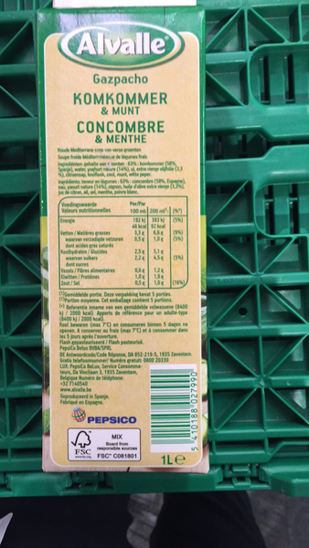 Rappel produit Gazpacho Vert, soupe froide de légumes Alvalle L'Andalousie a beaucoup d'influences mauresques et je trouvais intéressant de préparer un feuilleté qui reprenne celles-ci. De la nature Nos gazpachos sont élaborés à partir de légumes récoltés au plus près de notre lieu de production, dans un emballage recyclable. Laissez-vous surprendre par la fraîcheur du concombre alliée au parfum subtil et intense de la s concombres délicatement moulinés puis agrémentés d'huile d'olive extra vierge, de... Elles ne sont pas forcément exhaustives et ne sauraient se substituer aux informations figurant sur l'emballage du produit qui font seules foi, et auxquelles vous êtes invités à vous reporter, notamment en cas d'intolérance alimentaire., La brique de 1L si je devais émettre un petit regret, c'est que le gaspacho est légèrement trop salé à mon goût. J'ai eu du mal à en trouver des briques de 1 l car tous les... Gaspacho Tomate Soupe Froide Concombre Et Menthe Gazpacho Tomate PepsiCo France SNC 420, rue d'Estienne d'Orves 92705 Colombes CEDEX Ingrédients Concombre (57,7%), eau, yaourt nature (14,0%), oignon, huile d'olive extra vierge, jus de citron, ail, sel, menthe (0,07%), poivre blanc, teneur en légumes: 63% Allergènes : LAIT Mode d'emploi A conserver au réfrigérateur et à consommer dans les 5 jours suivant l'ouverture à conserver au frais., Max. Les indications ci-dessus sont données à titre d'information.