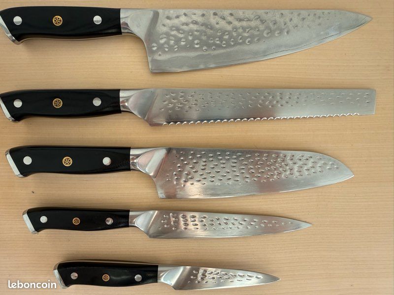 Precise cryogenic tempering with liquid nitrogen increases the steel's crystalline structure, enhancing strength, flexibility and hardness. To further enhance the beauty, an intricate copper mosaic pin adorns the center rivet. The increased blade width allows for improved knuckle clearance. Carefully hand polished, the ergonomic handle shape is engineered for superior hand control, agility and comfort. Conçu à la perfection: Poignée G-10 ultra-haut de gamme de qualité militaire avec une durabilité à vie. Soigneusement polie à la main, la forme ergonomique de la poignée est conçue pour un contrôle, une agilité et un confort supérieurs. Broche de lame polie à la main pour une manipulation fluide 8'' Chef Knife Dalstrong Shogun Series Aus-10v Dalstrong Couteau D'office - 3,5" - Série Shogun - Damas - AUS-10V Dalstrong Shogun 8'' Chef Knife Couteau Shan Zu An essential addition to your kitchen, perfect for peeling potatoes or apples, coring tomatoes or pears, carving a pumpkin or curling a slice of citrus peel. Once you experience the versatility of this tiny chef’s knife, you’ll never know how you lived without it. The exquisite hammered tsuchime finish is not only a beautiful statement in craftsmanship, it also serves the purpose of reducing drag and minimizing stuck on food. Hand-polished blade spine for smooth handling. DALSTRONG Enseble De 3 Couteaux D'office - Série Shogun - Daas... The red version is meticulously constructed of extremely durable ABS, highly impervious to heat and moisture. Each knife is hand-finished in the Honbazuke 3-step method, creating a beautiful mirror polished edge at a staggeringly acute 10 degrees per side. Beautifully engraved into the blade near the bolster is the Dalstrong lionhead logo for further refinement. Couteau dentelé tout usage DALSTRONG - Série Shogun - AUS-10V (Traité The super-steel core possesses extra high carbon levels, allowing for scalpel-like sharpness with exceptionally long lasting edge retention. while simultaneously being stabilized with an engraved end-cap for agile performance. The Shogun Series of knives are what careers are built on. For peeling potatoes or apples, coring tomatoes or pears, carving a pumpkin or curling a slice of citrus peel, there’s no better blade. Painstakingly crafted over 60 days using the highest quality materials, each knife in this series is a razor-sharp culinary tool and artistic statement. Unrivaled Performance: Ruthlessly sharp blade hand finished to a mirror polish at 8-12° using the traditional 3-step Honbazuke method. Now you are slicing with POWER., Dalstrong POWER!