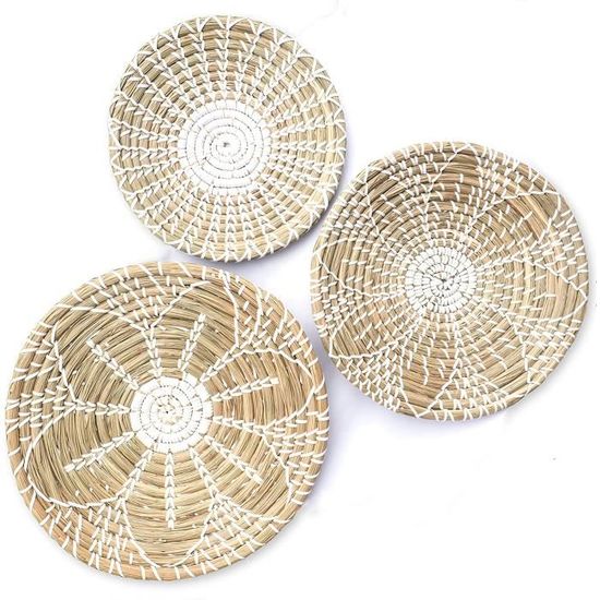 Description du produit Corbeille décorative pour le salon Décoration Bohème Main RXMORI Lot 3 Paniers Muraux Bohème En Rotin - Tissés Main - 25cm, 30cm, 35cm - Décoration Maison Panier Mural Osier Étagère murale bohème en macramé fait à la main avec pompons tissés... Apportez de la chaleur et du caractère à votre maison avec cet ensemble de 4 décorations murales en panier tissé. Les délicats motifs en macramé complètent magnifiquement les paniers en osier tressé, créant une esthétique bohème harmonieuse. Corbeille décorative pour la chambre à coucher Cette collection de plateaux décoratifs est une excellente façon d’ajouter un peu de légèreté. Vous pouvez également les offrir à votre famille ou à vos amis en cadeau, et ils seront très heureux de les avoir. Style bohème enchanteur : nos paniers muraux bohèmes sont fabriqués à partir d'herbiers naturels qui contiennent les éléments du roseau naturel, y compris des tons blancs, beiges et marron. Facile à installer : accrochez-les simplement au mur pour transformer instantanément vos murs en une superbe vitrine bohème. Apportez de la chaleur et du caractère à votre maison avec cet ensemble de 4 décorations murales en panier tissé. Vous pouvez également les offrir à votre famille ou à vos amis en cadeau, et ils seront très heureux de les avoir. Lot de 9 paniers muraux bohèmes tissés à suspendre... Deco Murale Bois Lot De 5 Paniers Muraux Noirs Bohèmes Avec Franges, Décoration Murale Naturelle, Art Mural Bohème, Sets De Table Ronds En Osier, Décoration Murale Bohème, Décoration Murale En Raphia - Canada Atmosphera Decoration Rehaussez votre décoration intérieure avec cet ensemble de quatre pièces de décoration murale en panier tressé.