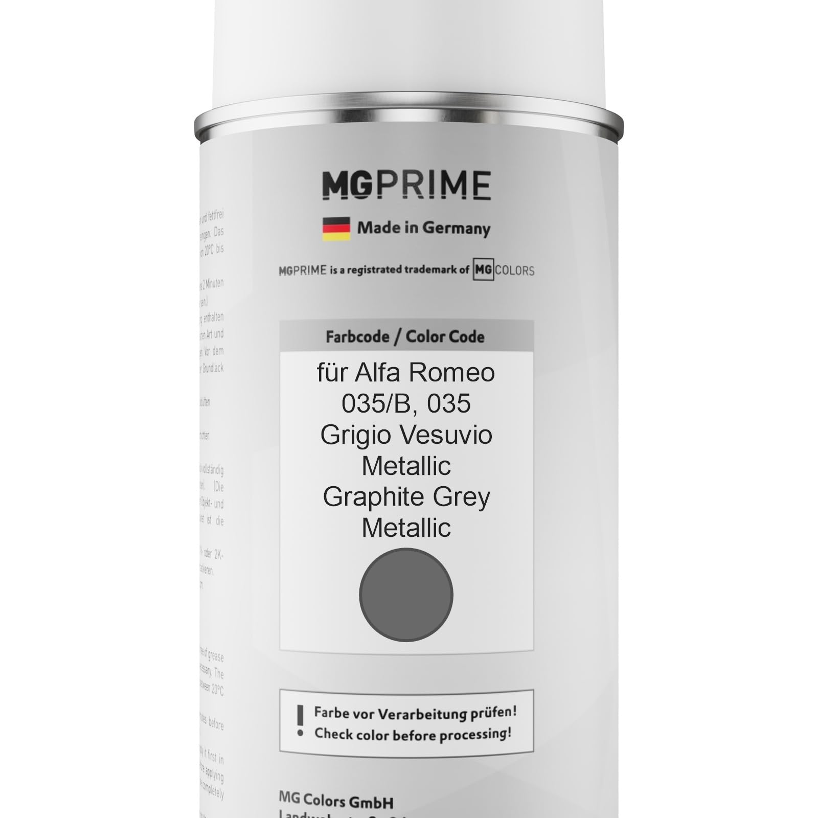 Modèle du véhiculeCette peinture a été utilisée entre autres pour les véhicules suivants, départ usine:Pour Alfa Romeo Stelvio (2017 - 2025) MG PRIME Peinture voiture Bombes aérosols pour Alfa Romeo 035/B / 035 Grigio Vesuvio Metallic / Gris Vesuvio Peinture de base vernis clair aérosol 400ml Marque de voiture: Pour Alfa Romeo Codes de peinture: 035/B, 035 Noms de peinture: Grigio Vesuvio Metallic, Gris Vesuvio, Vesuvio Grey Metallic, Graphite Grey Metallic Taux de brillance: brillant Candidature La surface doit être dépoussiérée, sèche et exempte de graisse - nettoyez-la avec un décapant à base de silicone si nécessaire. Bombe Peinture Alfa Romeo 400ml Peinture Voiture Bombes Aérosols Pour Alfa Romeo 035 B Grigio Peinture Pour Alfa Romeo Agiter l'aérosol pendant au moins 2 minutes avant l'utilisation. 400 ml suffisent pour environ 1,3 m². Qualité professionnelle - Made in Germany Vaporisez l'objet avec une couche de fond et laissez-le clignoter. 035B Grigio Vesuvio Met. pour carrosserie Alfa Romeo Très bon pouvoir couvrant grâce à la forte teneur en pigments de l'encre Séchage rapide, excellente adhérence et très grande précision des couleurs bombes aérosol, chacun avec une buse de tête de pulvérisation réglable 035/B · Nom : Grigio Vesuvio · Années : 2015 / 2025 · Marque : Alfa Romeo · Couleur dominante : Gris · Couleur d'apprêt conseillé : Gris Clair · Type de... Peinture 035B Grigio Vesuvio Met. Couche de base en qualité OEM 400ml bombe aérosol vernis brillant