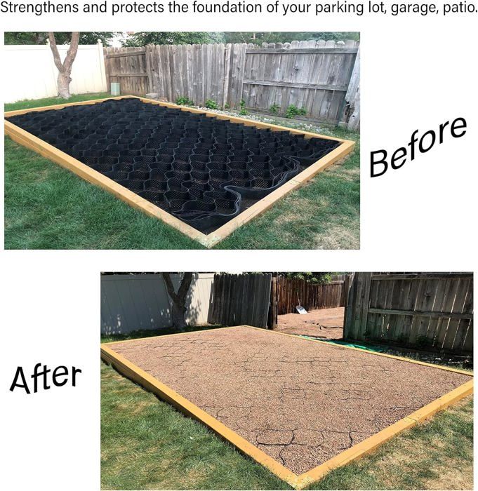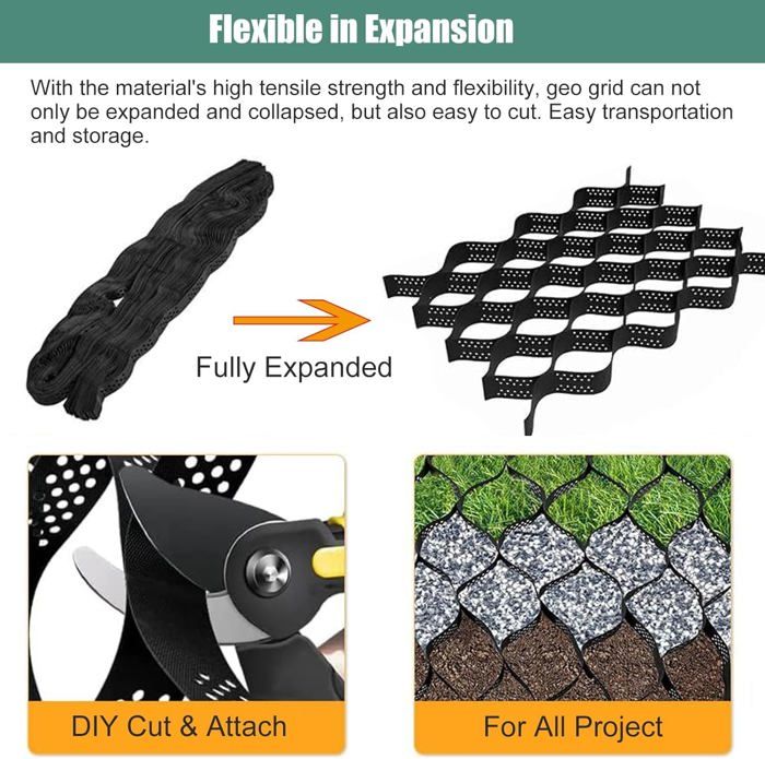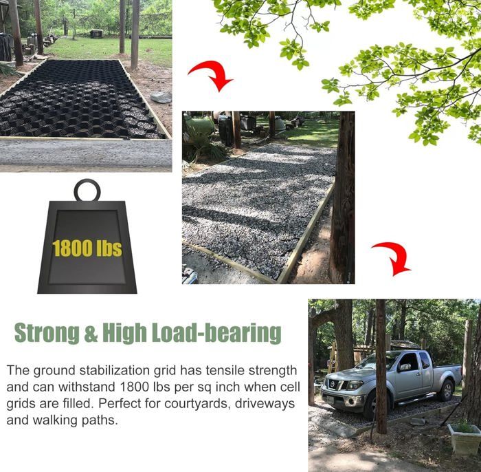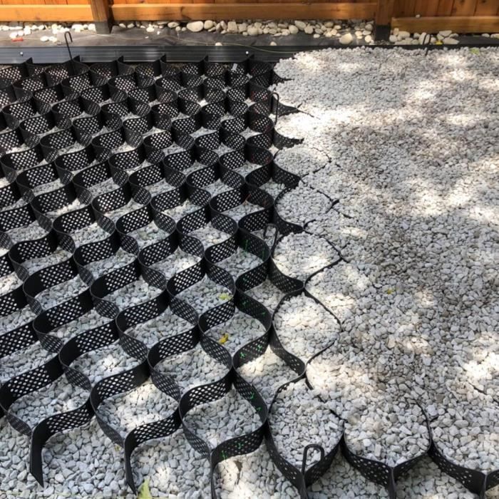- Connexion pratique et vitesse de construction rapide. Stabilisateur De Gravier Carrossable Stabilisateur Gravier Gazon Dalle Stabilisatrice 5 10 15 CmGrand Géogrille Avec Trous De Grille De Gravier Géocellulaire - Matériau HDPE flexible pour une utilisation longue durée et durable. Stabilisateur Gravier Stabilisateur De Grille Geocell Évolutif, Pavoule... - Soudé par ultrasons, excellente résistance à la traction. Ce système de grille géocellulaire est utilisé pour confiner la pierre, le gravier ou le sol afin de fournir une surface stable. ● Spécification :- Matériau : HPDE (polyéthylène haute densité)- Zone de grille unique entièrement étendue : 40 cm x 40 cm (15,7 x 15,7)- Hauteur : 5 cm / 2 pouces- Épaisseur : 1,5 mm- Portant : 3000kg/6600 LBS (SQ FT)- La couleur noire- Peut être personnalisé : Oui- Peut être coupé : Oui● Fonctionnalité :- Force puissante et découpable. parfait pour les zones piétonnes et fréquentées et les zones avec des sols pauvres ou instables. - Largement utilisé pour de nombreux travaux de sous-sol, comme la zone sablonneuse / la région du pergélisol / le loess pliable. Les finisseurs dotés de la technologie de soudure supersonique ne s'enfonceront pas dans le sol avec de lourdes charges. - Flexible en expansion et en contraction, et peut être plié pendant le transport. Ce système de grille géocellulaire est utilisé pour confiner la pierre, le gravier ou le sol afin de fournir une surface stable. Il peut non seulement être utilisé comme coussin pour traiter les fondations molles, mais également pour construire une structure de soutènement. parfait pour les zones piétonnes et fréquentées et les zones... - Des erreurs mineures peuvent survenir en raison de différents lots et de mesures manuelles. La résistance à la traction et la flexibilité ont fourni votre taille personnalisée, telle que la coupe de bricolage et attachée, en modifiant les dimensions géométriques. Achetez maintenant chez VEVOR. - Peut être utilisé avec de l'herbe, du gravier, de la terre et du sable 100% perméable. ● Contenu de l'emballage- 1 × géogrille au sol● Remarque :- Si ça sent mauvais, placez-le dans un endroit ventilé. 【 3000 kg / 6600 LBS (SQ FT) 】 La grille de stabilisation du sol présente une résistance à la traction qui peut supporter jusqu'à 6600 LBS par pied carré lorsque les cellules sont remplies. stabilisateur de Gravier Géogrille Super Large H 5 Cm pour Terrains De