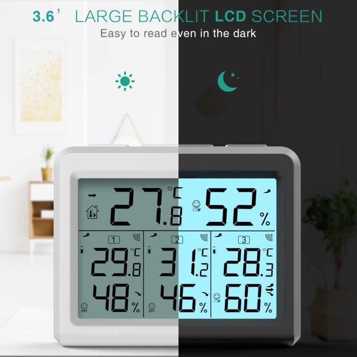 Thermomètre Intérieur Extérieur Fil Celsius Fahrenheit Switch Visible Design multifonctionnel : en plus de mesurer la température et l'humidité, ce thermohygromètre dispose également d'autres fonctions, telles que l'enregistrement maximum/minimum, la commutation de l'unité de température (Celsius/Fahrenheit), le calcul de la température du point de rosée, etc. ☀ Design multifonctionnel : en plus de mesurer la température et l'humidité, ce thermohygromètre dispose également d'autres fonctions, telles que l'enregistrement maximal/minimum, la commutation de l'unité de température (Celsius/Fahrenheit), le calcul de la température du point de rosée, etc. Caractéristiques: Affichage sur le même écranGrand écran LCD rétroéclairé de 4,6 pouces, les grands chiffres vous éclairent en un coup d'œil : l'hôte de température et d'humidité et 3 capteurs surveillent, la tendance et le confort, et comprennent facilement l'environnement changeant actuel. Commutez librement ℃/℉. Surveillance en temps réel:La plage de mesure de ce compteur... Lot De 3 Thermomètres Analogiques En Bois Pour Extérieur, Intérieur Et ExtérieurThermomètre... ☀ Largement utilisé : ce thermomètre et hygromètre est adapté à divers endroits, tels que les serres, les serres, les fermes intérieures, les maisons, les bureaux, etc. Station Météo Sans Fil, Thermomètre Hygromètre Numérique d pour vous aider à surveiller la température et l'humidité et fournir les conditions environnementales les plus appropriées. ☀Facile à installer et à transporter : ce thermomètre et hygromètre adopte un design portable, est léger et pratique, et peut être installé sur le mur, étagère, ou placé sur la table à l'intérieur ou dans une serre à tout moment pour répondre aux besoins de différents scénarios. ☀ Réponse sensible : le capteur de température et d'humidité est très sensible et peut rapidement détecter les changements de température et d'humidité de l'environnement et mettre à jour les données en temps opportun pour vous permettre de comprendre l'état environnemental actuel. Découvrez le Top 3 des meilleurs thermomètres hygromètres intérieur digitaux en 2024.Comparatif, avis détaillés et guide d'achat pour choisir le modèle idéal.Cliquez ici ! offrant plus d'options d'utilisation et de commodité.