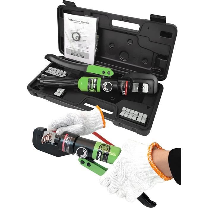 Poignée antidérapante et isolée : ressort de rappel innovant. <br/Matériau de qualité supérieure : l'outil de sertissage de tuyau est construit en acier 40CR avec processus de perforation et de forgeage et traitement par pulvérisation pour garantir des propriétés mécaniques intégrées. Réinitialisation Suite au sertissage, orientez la valve en sens contraire des aiguilles d'une montre Nous offrons un service après-vente parfait. Si le produit présente des problèmes de qualité, nous pouvons offrir un service de remplacement ou de remboursement. Les pompes à piston haute pression, fabriquées en acier allié, présentent une résistance et une durabilité exceptionnelles. Installer Installez la matrice de sertissage qui correspond à la taille du câble. Emballage du produit ① Pince à sertir hydraulique AMZCNC YQK-70 (force de sertissage standard : 80 KN. Force de sertissage maximale : 100 KN. AVC: 11 mm) - ② 4-70 mm² - 9 jeux de formes : 4/6/8/10/16/25/35/50/70mm² ; ③ 2 paires de joints d'étanchéité ; ④ Isolation et ue résistante aux chocs ; ⑤ Carte de contact du service client.