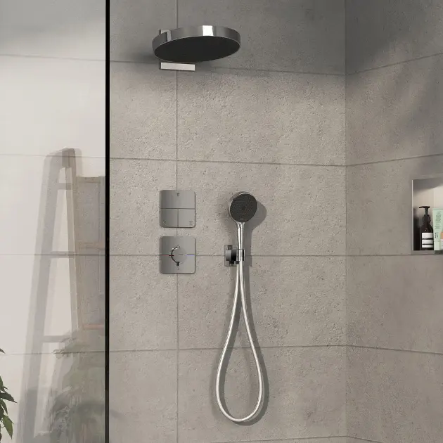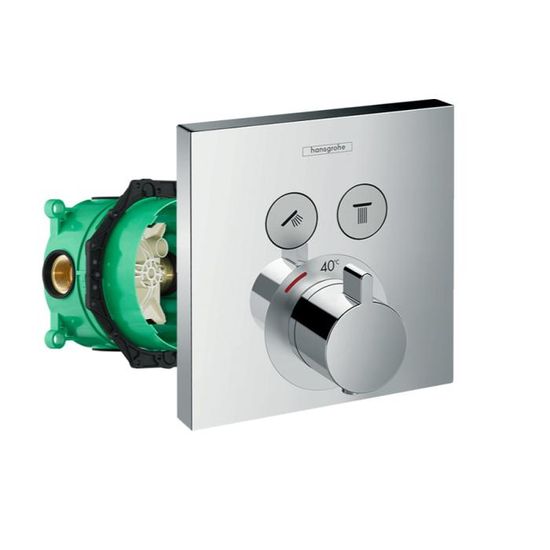 Autres particularités Facile à nettoyer : Il suffit d’essuyer les buses en silicone de la pomme de douche pour en enlever le calcaire (QuickClean) Douche Hansgrohe Raindance Select Façade Pour Mitigeur Thermostatique Encastré HANSGROHE ShowerSelect Avec 2 Fonctions Blanc Mat Hansgrohe Colonne Douche Il contient le thermostat contrôlant les deux douches. Hansgrohe marque allemande experte dans la robinetterie sanitaire vous propose ce kit de douche encastré qui allie qualité et design pour votre douche. Composition du pack : Douche de tête 243x243 mm, bras de douche Douchette, coude de raccordement, support de douche, flexible de douche Mitigeur thermostatique Corps d'encastrement Il réagit instantanément et protège ainsi de l’eau trop chaude ou trop froide. Une touche située sur la pomme de douche (Select) permet de passer d’un jet à l’autre. La température se règle avec précision à l’aide d’un sélecteur ergonomique. Sur le thermostat, un bouton permet également d’ouvrir et de fermer l’eau. Jusqu’à 15 ans de garantie sur les pièces détachées après l’expiration de la gamme. Douche pluie : Douche de tête avec deux types de jet : Rain et RainAir. À l’extérieur, le design séduisant crée plus d’espace sous la douche. hansgrohe Pack encastré Design ShowerSet Raindance Select E Tout est fourni : système de douche complet avec thermostat, douche de tête et douchette pour montage encastré Douchette avec trois types de jet : Rain, RainAir et Whirl Se composant de : Douche de tête Raindance Select S 240 2jet avec bras de douche 390 mm (#26466000) Douchette Raindance Select S 120 3jet (#26530000) Isiflex. Système céramique de mélange durable de hansgrohe Comprenant : Système de douche encastré, matériel de montage, instructions de montage Confort intense : le thermostat maintient la température souhaitée et empêche que l’eau ne soit trop chaude ou trop froide Plaisir de la douche : cette douchette de 120 mm et la douche de tête de 240 mm donnent un jet intense et régulier (performances XXL)