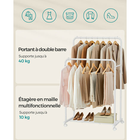 Que ce soit dans une chambre, une buanderie ou une vente au détail, cette étagère s'intègre parfaitement à n'importe quel décor, offrant une solution élégante et efficace à vos besoins de stockage. GJAGXQ Blanc Portant À Vêtements En Métal, Portant Vetement Solide Tringle À Vêtements Avec étagère De Rangement Inférieure Tringle À Vêtements Robuste, Tringles À Vêtements For Chambre À Coucher Le porte-vêtements soigneusement conçu pour accrocher des vêtements comprend des tiges réglables pour plus de flexibilité, pouvant accueillir tout, des chemises aux robes longues. Portant à vêtements en métal, porte-vêtements, porte-manteau longueur... Doté de roulettes à 360° faciles à rouler, dont deux qui verrouillent pour plus de stabilité, ce portant à vêtements suspendu glisse facilement sur n'importe quelle surface, simplifiant la réorganisation. Transformez votre espace avec notre portant à vêtements polyvalent conçu pour mettre de l'ordre dans votre garde-robe en toute simplicité. Fabriqué en acier robuste, ce portant à vêtements pour suspendre les vêtements dispose d'un design capable de supporter jusqu'à 18 kg. Ce petit portant à vêtements offre une solution compacte mais efficace pour le rangement des vêtements, maximisant votre espace disponible tout en offrant suffisamment de place pour vos vêtements. Que ce soit pour repositionner l'organisateur de vêtements dans votre maison ou pour déplacer les étagères à vêtements pour accrocher des vêtements dans un environnement de vente au détail, sa fonction de mobilité offre une grande commodité L'étagère inférieure en maille peut contenir des chaussures ou des boîtes de rangement, tandis que les crochets latéraux offrent des options de suspension supplémentaires. Une étagère inférieure ajoute de l'utilité, offrant un espace supplémentaire pour les chaussures ou les boîtes de rangement, vous aidant à garder votre environnement propre. Installer un support à vêtements n'est pas très difficile, car la plupart du temps, le montage de ce type de penderie se fait par emboîtement. Pour commencer, libérez une place assez grande afin d'étaler les pièces, et séparez les barres transversales des montants latéraux pour vous y retrouver. Commencez par monter la structure supérieure (les mon... Voir la liste complète sur Si, à l'origine, les penderies mobiles étaient basiques (2 barres, 2 montants, 2 pieds), elles sont aujourd'hui plus sophistiquées et deviennent, pour certaines, de véritables mini-dressings. Il existe des modèles agrémentés de roulettes (déplacement facilité) et d'autres dont le socle est renforcé par plusieurs barres de soutien permettant d'y acc... Voir la liste complète sur Comme il s'agit juste d'une structure ajourée, la penderie mobile ne permet pas de protéger les vêtements comme c'est le cas à l'intérieur d'une armoire. Mais pas de panique, il existe des solutions ! Sur notre site , vous pouvez vous procurer toutes sortes de housses à vêtements (pour manteaux, chemises, costumes, etc.) qui mettront vos a... Voir la liste complète sur Son design durable résiste à une utilisation quotidienne sans effort Idéal pour optimiser l'organisation dans des espaces restreints Portant à vêtements robuste VEVOR avec doubles tiges de suspension, étagères supérieures/inférieures, roues verrouillables et capacité de 300 lb pour des solutions de rangement polyvalentes et robustes. Le porte-manteau peut accueillir une variété d'articles, y compris des chemises, des robes et des vestes Construction robuste : fabriqué à partir de métal robuste avec une finition lisse, ce portant à vêtements assure stabilité et résistance. En moins de 30 minutes, vous pouvez configurer votre portant à vêtements pour accrocher des vêtements, ce qui en fait un ajout sans tracas à votre espace de vie pour un rangement organisé Portant à Vêtements En Métal Et Bois Avec Roulettes 72 X 31 X 153 Cm Box Beyond 92774321