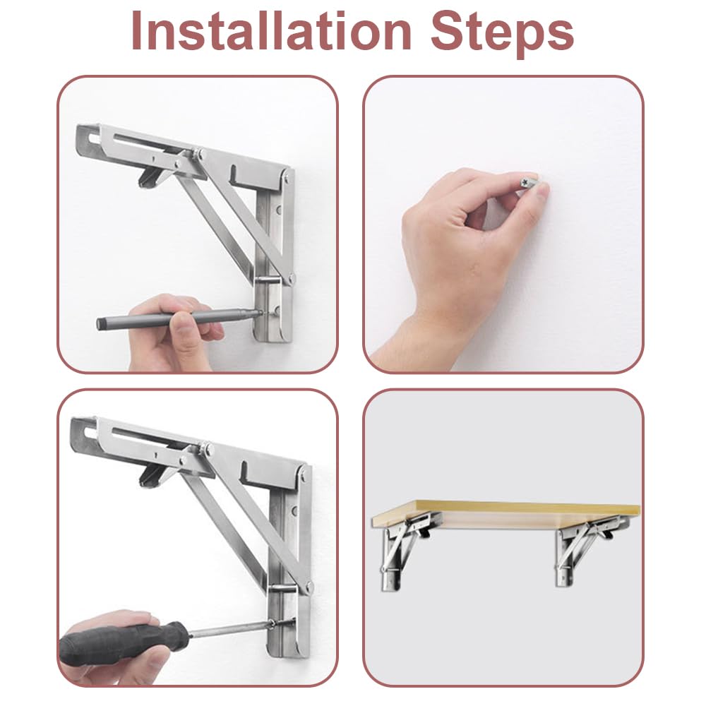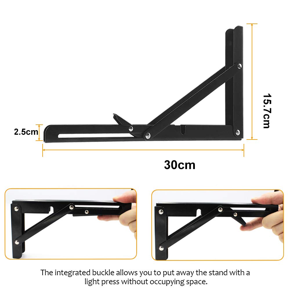 en raison de l'effet de lumière, la couleur réelle peut être légèrement différente de celle de la photo. 【Dimensions du Produit】2 Pièces equerre pliante charge lourde de 30 cm de long, 17 cm de haut, 19 cm de diagonale, 2,5 cm de large, avec vis en acier inoxydable et chevilles (planches non incluses). 【Large éventail d'Utilisations】Charniere tablette rabattable parfait pour de nombreux travaux de bricolage. Viesap Équerre Pliante350mm, 2 Pièces Support Console Pliable En Acier robuste et durable, pas facile à déformer, capacité de charge maximale de 10 à 150 kg, en fonction du matériau mural utilisé. 【Conception peu Encombrante】Support rabattable en se verrouillant à un angle de 90 degrés, il n'y a qu'une seule surface de montage, ce qui réduit l'encombrement. Ces supports pliants robustes sont en acier inoxydable et ont une capacité de charge maximale de 40 kg. ... Les modèles comprennent 200 mm, 250 mm, 300 mm ou des... 【Facile à Installer】équerre pliante bras de support court comporte 3 trous pour le tube d'expansion et de longues vis pour fixer le support au mur et le bras de support long à une planche. il suffit d'appuyer sur le bras de déverrouillage pour le déplier, facile à utiliser, peut être plié et caché lorsqu'il n'est pas nécessaire pour économiser de l'espace, peut garder votre chambre et votre maison propre et ordonnée. 【Matériau de Qualité】Equerre rabattable fabriqué en acier inoxydable avec une bonne résistance à la corrosion et à la rouille, résistant à l'humidité et ne se déformant pas facilement. salon, cuisine, salle de bain, chambre à coucher, bureau, balcon, magasin, atelier, buanderie, bateau, caravane, arrière-cour, peut être utilisé comme étagère à livres, étagère de cuisine et étagère d'exposition. Gardez sa chambre bien rangée. [Forte Capacité Charge] Le support pliant utilise des tiges de support épaissies et élargies pour améliorer la durabilité et la dureté, ainsi qu'une structure triangulaire stable qui rend l'installation plus solide et plus stable et peut supporter jusqu'à 50 KG Etagere Escamotable 2 Pièces Équerre Pliante,Support Console Pliable En Acier Equerre Pliante capacité de charge maximale : 10-150kg.