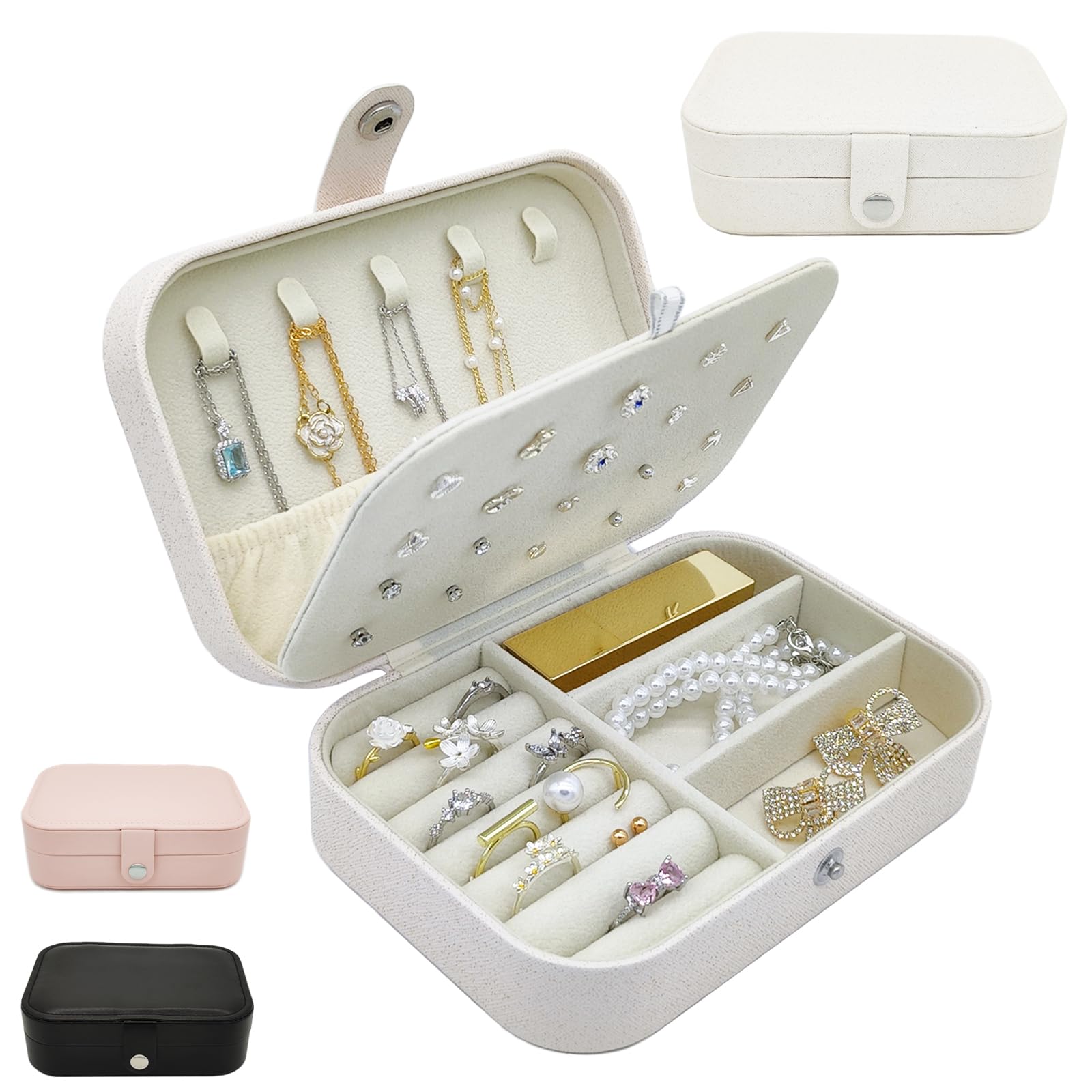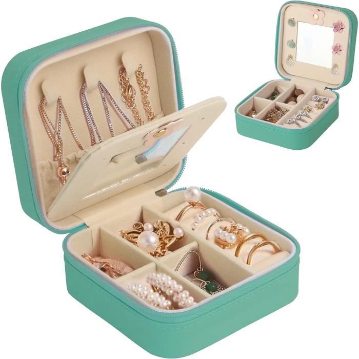 Cette boîte à bijoux de voyage Neveika avec miroir est de qualité supérieure, fabriquée en cuir synthétique de haute qualité à l'extérieur et doublée de velours perlé doux à l'intérieur, avec un mini miroir de maquillage dans le compartiment central. Haute qualité : l'extérieur est fabriqué en cuir synthétique de haute qualité et l'intérieur est doublé de velours perlé doux pour protéger vos bijoux des... Zone de rangement : le haut de cette boîte à bijoux contient 3 crochets pour collier, 1 poche élastique pour ranger vos colliers, le compartiment central avec un mini miroir de courtoisie, pratique pour porter vos accessoires, les boucles d'oreilles peuvent être rangées de chaque côté du miroir, le fond est des compartiments amovibles et des emplacements pour bagues, différentes zones pour garder vos bijoux bien organisés. Boite A Bijoux En Cuir Tbest Boîte à Bijoux Portable De Voyage Mini Boîte De Rangement Pour Bagues En Cuir PU Petite Boîte à Bijoux De Voyage Design pratique : la fermeture éclair lisse peut facilement ouvrir la boîte à bijoux, peut également empêcher la boîte à bijoux de s'ouvrir pendant le voyage pour éviter la perte de bijoux. BOÎTE DE RANGEMENT pour bagues, boîte à bijoux décorative pour comptoir... Yarmiene Boite a Bijoux, Grande Boîte à Bijoux avec 2 Étages, Organisateur de Bijoux de Voyage Compact et portable : l'organisateur de bijoux de voyage ne mesure que 9,5 x 9,5 x 5 cm, il peut être facilement mis dans votre sac à main ou votre valise, facile à transporter et à utiliser pour les voyages d'affaires et les voyages. Petite et délicate, la boîte à bijoux peut être placée dans un sac à main, adaptée pour un usage personnel, les voyages, la décoration de la maison, ou comme cadeau de mariage, d'anniversaire, de Saint-Valentin, de Noël pour vos amis ou vos proches