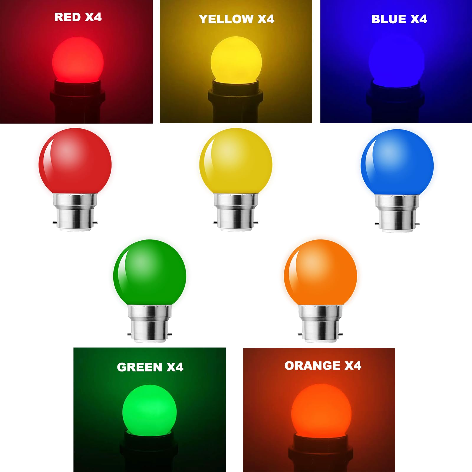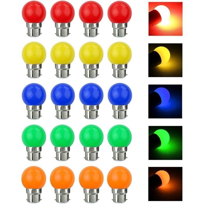 Économie d'énergie Avec seulement 2 Watts, l'équivalent d'une ampoule halogène de 20 Watts, cette ampoule permet d'économiser plus de 85% sur votre facture d'électricité. Caractéristiques du produit Multicolore Beaucoup de couleurs pour votre choix, nous avons plus de 10 couleurs pour répondre à vos différents besoins, rouge, jaune, bleu, vert, orange, poudre, violet, violet, blanc chaud, blanc froid, etc. Ampoule LED à Baïonnette B22 3W,Ampoule Mini Globe Golfball B22 G45,Blanc Chaud 3000K,280LM,Non Dimmable,Lot de 10 [Classe énergétique G Applications étendues Appliquer l'éclairage domestique, les lampadaires de nuit, mariage, les décorations de Noël, les fêtes de jardin. Équivalent halogène : équivalent à 20W Économise jusqu'à 85% d'énergie, aide à réduire vos factures d'électricité. Paramètres Prise: prise standard B22 , Puissance : 2 watt 🏮 Incassable plastique traité anti-uv et LED. 🏮Durable: Ces lumières LED 2W, comme toutes les LED, sont économes en énergie et respectueuses de l'environnement. Construction robuste en matériau spécial PC, coque résistante au feu et aux chocs, durable et sûre. Applications étendues Multicolore Nous avons plus de dix couleurs pour votre choix, rouge, jaune, bleu, vert, orange, rose, violet, blanc chaud, blanc froid, etc. Ampoules De Couleur MZYOYO Lot De 20 Ampoule LED Couleur B22 Baillonette,Ampoules B22 LED 1W G45,Ampoule Guirlande Exterieure,Équivalent 5W,Rouge Jaune Bleu Vert Orange, Pour Chaîne,Veilleuses De Fête Ampoule Guirlande Guinguette Ampoule Led Couleur E27 4W Équivalente 40W Ac 220V-240V, Ampoules Guirlande Couleur Led G45... Ampoules LED à angle de faisceau de 360 degrés, s'allument instantanément à pleine luminosité sans délai. Flux de lumière: 200LM , Taille: 45mm x 70mm