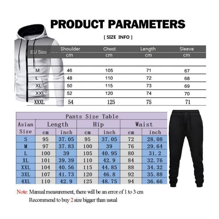 Matière : mélange de coton. Couleur : blanc/rouge/violet/noir/rose/gris clair/bleu marine/orange/kaki/bleu/gris foncé., Motif : couleur unie., Style : décontracté., Col : à capuche. L - Longueur du haut : 69 cm - Buste : 100 cm - Épaules : 46 cm - Longueur du pantalon : 101 cm - Tour de taille : 74 cm - Hanches : 90 cm. Contenu : 1 sweat-shirt à capuche, 1 pantalon. Si le produit a des problèmes de qualité, n'hésitez pas à nous contacter. Longueur du pantalon : 102 cm. Longueur du haut : 69 cm., Buste : 110 cm., Épaules : 46 cm. Pantalon de jogging : pantalon long, pantalon à bande de cheville, avec cordon élastique pour ajuster la taille, avec poches. Ensemble de survêtement 2 pièces pour homme - Sweat à capuche à manches longues - Tenue de sport décontractée et confortable - Pantalon long pour homme Tableau des tailles : Dimensions (cm) : S - Longueur du haut : 65 - Buste : 102 - Épaules : 42 - Longueur du pantalon : 98 - Tour de taille : 68 - Hanches : 92 M - Longueur du haut : 67 - Buste : 106 - Épaules : 44 - Longueur du pantalon : 100 - Tour de taille : 71 - Hanches : 96 L. XL - Longueur du haut : 27,95 cm - Buste : 14,88 cm - Épaules : 18,90 cm - Longueur du pantalon : 100,94 cm - Tour de taille : 76,2 cm - Hanches : 102,4 cm. Tailles : S/M/L/XL/XXL/XXXL Pour homme., Âge recommandé : adultes., Utilisation : extérieur., Contenu : 1 sweat à capuche., 1 pantalon de sport Ensemble de survêtement essentials 3 stripes Adidas Sportswear | La Redoute Tour de taille : 77 cm., Hanches : 104 cm. Survêtement De Sport - Manches Longues - Rouge - Indoor - Multisport Survêtement de sport pour homme - Pull à manches longues - Sweat à... Dimensions : Taille S : longueur du haut : 65 cm, tour de poitrine : 102 cm, épaules : 41 cm, longueur du pantalon : 98 cm, tour de taille : 67 cm, hanches : 91 cm. Matériau : ensemble de survêtement 2 pièces pour homme fabriqué en coton mélangé, confortable, respirant, doux pour la peau et absorbant la transpiration, doux et lisse, pas facile à déformer. 3XL Longueur du haut : 75 cm, tour de poitrine : 122 cm, épaules : 52 cm, longueur du pantalon : 108 cm, tour de taille : 83 cm, hanches : 112 cm. Longueur du pantalon : 104 cm. 3XL Longueur du haut : 29,53 cm, tour de poitrine : 48,03 cm, épaules : 20,47 cm, longueur du pantalon : 42,52 cm, tour de taille : 82,68 cm, hanches : 111,9 cm.