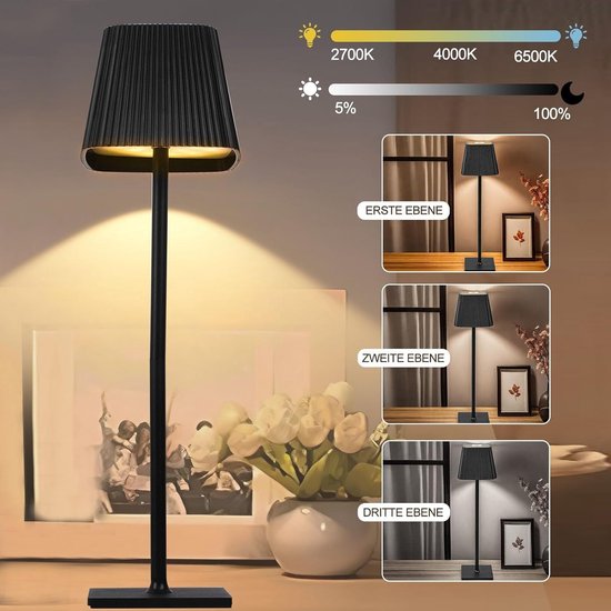 【Conception multifonctionnelle】 La lampe rechargeable est composée d'un corps de lampe, de tiges de lampe amovibles et d'un socle, ce qui permet d'ajuster la hauteur et de la convertir en lampe de poche pour répondre à différents besoins d'éclairage et offrir une utilisation flexible. Skelo Lampe De Table Sans Fil à Intensité Variable Tactile Batterie 3 Couleur 3 Hauteurs IP54 4800 MAh Convient Pour L'intérieur Et L'extérieur Rechargeable USB-C Métallique Noir 2 Pièces Décorée sur un comptoir de bar ou une table, elle apporte style et tendance. Description du produit Lampe LED Elitlife Elitlife est une marque renommée qui propose des solutions d'éclairage LED de haute qualité. Paquet de 2 lampes de bureau LED sans fil pliables-lampes de Table à... Variation tactile intelligente : en touchant simplement le corps de la lampe, vous pouvez facilement basculer entre trois températures de couleur (2700 K, 4000 K, 6500 K) et régler la luminosité de 10 % à 100 %, ce qui convient à différents environnements et répond aux différents besoins de lecture, de travail et de détente. Après l'allumage, le haut s'allume également, ce qui facilite l'ajustement ou l'éteindre dans un environnement sombre. Lampe De Table Led Rechargeable À Intensité Variable - Blanc Chaud Avec... Salon Dans le salon, la lampe de table sert d'élément décoratif pour un éclairage chaleureux et relaxant sur les tables d'appoint ou les étagères. Les différentes hauteurs offrent une solution pratique pour différents besoins d'éclairage. Lampes de table sans fil, lampe de bureau rechargeable, lampe Bar La lampe de table dans les bars crée un environnement accueillant et confortable pour les invités. Elle offre une lumière agréable sur les tables pour les invités. Restaurant et café Cette lampe de table crée une atmosphère accueillante dans les restaurants et les cafés. Luminosité et température de couleur réglables - Trois couleurs au choix Lampe de table LED de grande capacité : batterie au lithium haute capacité intégrée de 4800 mAh, prend en charge 8 à 14 heures d'éclairage continu, équipée d'un câble de charge rapide USB Type-C.
