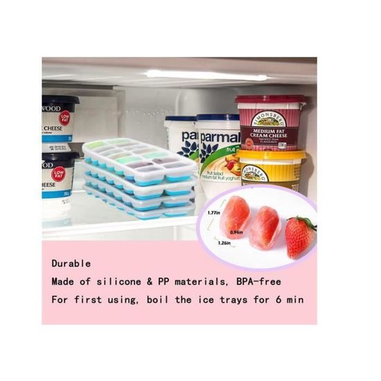 Certification LFGB et sans BPA., Passe au lave-vaisselle., Conseils : 1., N'utilisez pas de brosse métallique pour nettoyer ces bacs à glaçons., 2., Ne nettoyez pas les bacs à glaçons avec un détergent puissant au cas où ils seraient corrodés., 3., Gardez ces bacs à glaçons loin des sources de feu au cas où ils se déforment. Lot De 4 Bacs À Glaçons En Silicone Avec Crochet - 37 Compartiments Forme du cube : rectangulaire. Bac à Glacon Sans Bpa Lot De 4 Bacs à Glaçons Avec Couvercle Amovible Résistant Aux Déversements, Empilables, En Silicone Souple Avec Couvercles Pour Congélateur, Cocktails, Aliments, Chocolat, Café, Whisky Bac Glacon Bebe Diversification Dimensions du bac à glaçons : 25,4 x 10,2 x 3 cm. Que vous organisiez une fête à thème ou que vous souhaitiez simplement prendre un verre de café froid, le bac à glaçons fantaisie est d'une grande aide. Détails du produit : Contenu de l'emballage : lot de 4 bacs à glaçons, 4 couvercles Taille de la glace : 4,3 x 3 x 2,8 cm. Pourquoi choisir nos bacs à glaçons pour congélateur ? 1., Fabriqué à partir de silicone de qualité alimentaire et de matériaux PP, notre bac à glaçons garantit que tous vos besoins de congélation sont satisfaits., 2., Le haut du plateau maintient une structure en plastique ferme pour un transport sans déversement vers le congélateur, tandis que le fond intègre un design en silicone, assurant une libération transparente des glaçons chaque fois que vous en avez besoin., 3., Matériaux épais améliorés rendant les bacs à glaçons plus robustes et plus durables, pas de soucis de se casser facilement., 4., Avec une excellente flexibilité et résistance au froid, il est parfait pour faire des glaçons et diverses friandises glacées., 5., Le moule à glaçons est livré avec un couvercle amovible qui protège non seulement vos glaçons de toute odeur de congélateur, mais s'empilent également parfaitement les uns sur les autres., 6., Chaque lot comprend quatre plateaux, chacun capable de produire 14 cubes parfaitement dimensionnés (56 pièces au total), pour vous assurer que vous avez toujours des glaçons prêts., 7., En plus de faire des glaçons, ce bac à glaçons en silicone est également idéal pour congeler du jus, du café et d'autres boissons pour vous offrir une expérience rafraîchissante., 8., Après utilisation, il suffit de rincer le bac à glaçons à la main ou de le mettre au lave-vaisselle. Avec une excellente flexibilité et résistance au froid, il est parfait pour faire des glaçons et divers glaçons. Afin d'être plus pratique à utiliser des couvercles amovibles, chaque couvercle est conçu avec deux élévateurs de couvercle. Matériau : polypropylène et TPE (silicone) de qualité alimentaire. Si vous n'avez pas d'expérience positive sur nos bacs à glaçons, nous ferons tout ce qu'il faut pour nous assurer que vous êtes satisfait de votre achat. Chaque bac à glaçons produit 14 cubes parfaitement dimensionnés (pour un total de 56 pièces, soit 28,3 g), pour vous assurer d'avoir toujours de la glace pour diverses occasions comme les réunions de famille, les fêtes ou les installations de bar. En outre, ces bacs à glaçons en silicone pour congélateur avec couvercle peuvent être empilés facilement pour économiser de l'espace et garder votre congélateur propre et organisé tout en maximisant l'espace dans votre congélateur. Moules À Glaçons Géants Durables,2 Bacs À Glaçons,Ajoutez À Votre Set... Les matériaux épais améliorés rendent ces bacs à glaçons plus robustes et plus durables, pas de soucis de se casser facilement. 【Enlever les glaçons sans effort】 Libérer ces bacs à glaçons ne pourrait pas être plus facile, il suffit de pousser par le bas ou de tourner les moules à glaçons avec les deux mains, vous obtiendrez un seul cube pour votre café glacé ou l'ensemble du plateau pour refroidir un cocktail. Non seulement ce plateau fera des glaçons transparents, mais peut également ajouter des fruits, des cocktails, du vin, du whisky pour faire vos glaçons de différentes saveurs. Nous fournissons un service de retour et d'échange de 1 an.