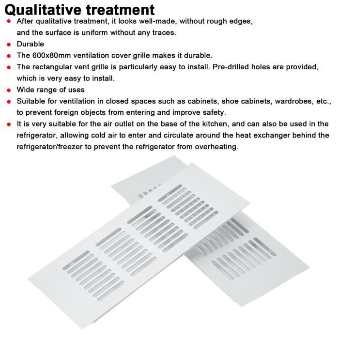 [Domaine d'Application] - Cette grille de couverture de bouches d'aération convient à diverses applications, notamment les armoires de cuisinière de cuisine, les armoires de distribution électrique de salle de bains, les plafonds de paroi latérale et les bouches d'aération de sol. Grille extérieure à lamelles en Aluminium - ronde DN 100 mm [- Bouches... Elle est livrée avec des trous pré-percés, ce qui rend le processus d'installation rapide et sans tracas. Bon Matériau : Notre grille de couverture de bouches d'aération est fabriquée en bon alliage d'aluminium, connu pour sa durabilité et sa résistance à la corrosion. Entrée D'air Hygroréglable QUARKZMAN Grille De Couverture De Bouches D'Aération, 1 | FindTheDeal Cache Aeration Fenetre Pvc CGEADY Garniture d'aile d'aération de Capot, Voiture ABS Soyez assuré que cette grille de couverture de bouches d'aération est répartie uniformément et offrira une ventilation fiable tout en ajoutant une touche d'élégance à votre espace. FindTheDeal : découvrez sans effort les offres de shopping sur FindTheDeal. Il vous suffit d'aligner la couverture avec la bouche d'aération ou l'ouverture souhaitée, de la fixer en place à l'aide des vis ou des fixations, et de profiter d'une meilleure ventilation en un rien de temps. Conception de Rainure Anti-Dérapante : La grille de couverture de bouches d'aération présente une conception unique de rainure anti-dérapante, qui aide à prévenir les glissements. 2 pièces anti-poussière filtre garde grille couve... – Grandado Cette conception de bande intérieure ondulée garantit que la couverture reste solidement en place une fois installée, offrant une solution de ventilation stable et sécurisée. La grille de couverture est conçue avec de petits trous de vis mesurant 3,5 mm de diamètre. Le diamètre intérieur mesure 267 mm x 34 mm, avec une épaisseur de 1,2 mm, permettant une circulation d'air optimale. [Conception de Rainure Anti-Dérapante] - La grille de couverture de bouches d'aération présente une conception unique de rainure anti-dérapante, qui aide à prévenir les glissements. [Installation Facile] - Notre grille de couverture de bouches d'aération est conçue pour une installation facile.