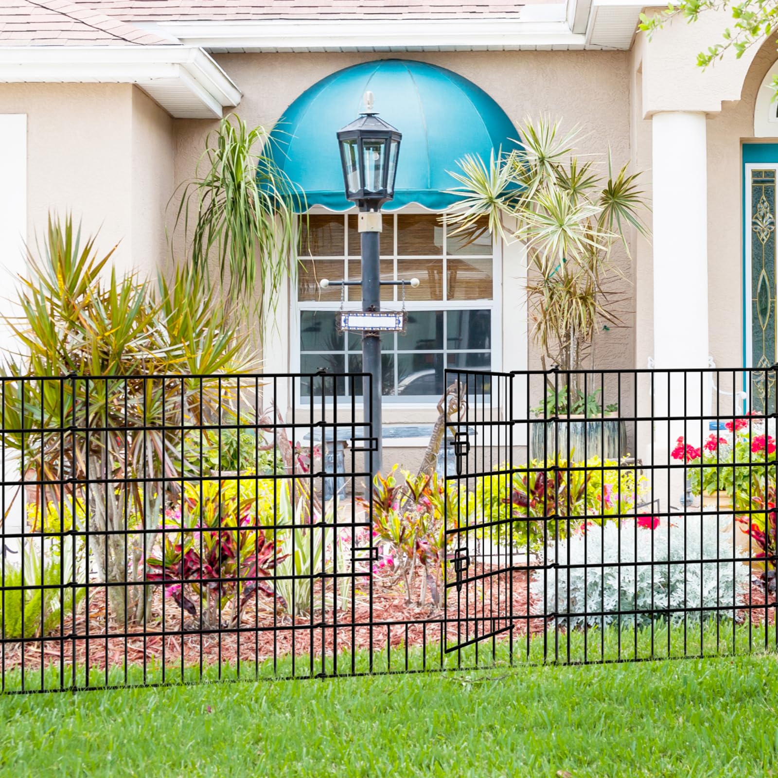 Cette clôture de jardin est un outil pratique pour diviser votre terrasse. Que ce soit autour d'une pelouse pour créer une limite sûre pour les enfants ou comme bordure pour les parterres de fleurs pour empêcher les fleurs précieuses d'être piétinées, elle tire le meilleur parti de chaque centimètre de votre cour avec élégance et praticité FOREHOGAR Clôture de jardin en métal avec portail 81,3 cm H x 3,7 m L, 1 portail + 5 panneaux de clôture pour chien, barrière pour animaux, clôture de jardin sans creuser pour cour, terrasse, parterre de fleurs, pelouse, extérieur, arche noire Taille de la porte : 78,7 cm (H) x 61 cm (l), chaque panneau de clôture mesure 81,3 cm (H) x 61 cm (l), chaque piquet mesure 95,2 cm, la longueur linéaire 3,7 m, couleur noire. Thealyn Clôture de jardin en métal 81,3 x 71,1 cm (5 panneaux Arifaro Clôture De Jardin Thealyn Clôture De Jardin En Métal 81 Cm H X 71 Cm L 4 Panneaux 1 Porte, Pour Chien Et Animaux Domestiques, Clôture De Jardin Pour Cour, Terrasse, Parterre De Fleurs Bordure Métallique Pour Jardin Il fonctionne parfaitement comme clôture avec portail. Large gamme d'utilisations : un bon choix pour l'aménagement paysager dans la pelouse, la cour, le patio ou le jardin, cette clôture de jardin avec portail peut être utilisée comme bordure de chemin, bordure de paysage, bordure de parterre de fleurs, bordure de légumes, protection d'arbre, clôture pour cour, clôture de jardin pour chiens, etc. Facile à installer : la clôture métallique est simple à installer et crée une bordure unique autour des fleurs, des plantes et des allées. Les piquets sont fabriqués en acier massif, et ils peuvent être étendus assez loin dans le sol, ce qui relie étroitement les panneaux de clôture et une position stable. Structure robuste : la barrière et les clôtures de jardin Forehogar sont soudées par des tubes en acier de haute qualité de 1 x 1 cm, elles sont très robustes. Portail de jardin | Portail de clôture | Portillon de jardin 85x150 cm... Contenu : 1 portail + 5 panneaux + 7 piquets dans un lot.