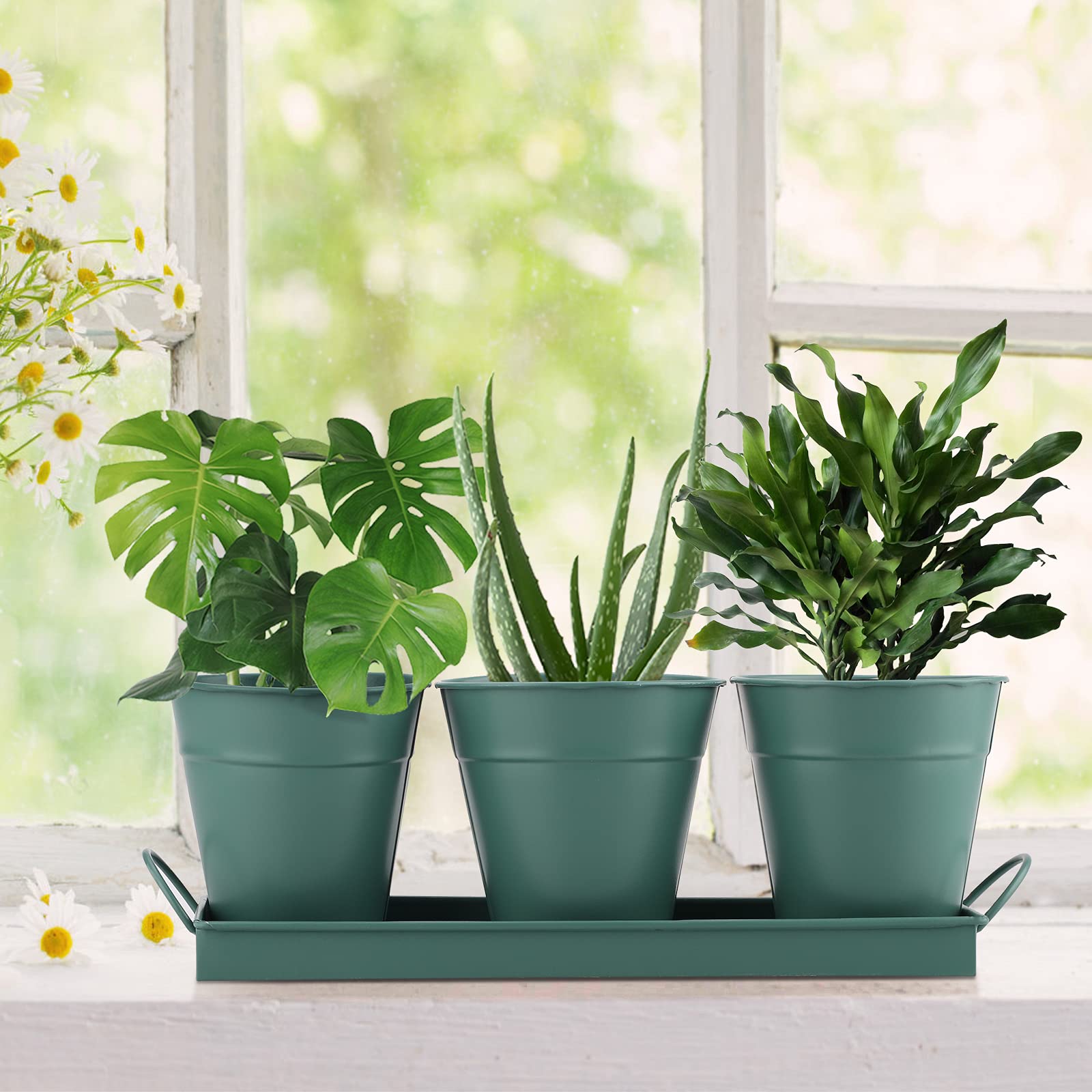 En utilisant des matériaux de qualité supérieure et des designs amusants, nous sommes en mesure d'apporter une touche bohème élégante à la décoration tout en nous assurant que vos plantes ont les bonnes conditions pour prospérer Notre ensemble de jardinières à herbes promet de transformer votre maison en un lieu d'élégance et de fraîcheur où de superbes arômes et saveurs se mélangent pour ravir vos sens. Parfait pour vos plantes d'intérieur : avec un style mignon avec un design pratique, nos pots de fleurs décoratifs sont parfaits pour cultiver vos propres herbes fraîches, telles que le romarin, le thym, le persil ou le basilic, mais aussi de belles plantes d'intérieur et de fleurs et ajouter de la fraîcheur à votre intérieur Polyvalents et élégants, ces pots de jardin en métal feront un bel ajout à votre jardin d'intérieur Fiable et robuste : la jardinière DMJJSD pour rebord de fenêtre est fabriquée en métal, offrant une maison fiable et robuste pour vos amis verts ; cette constitution robuste garantit que les pots peuvent résister à diverses conditions météorologiques sans perdre leur charme et leur fonctionnalité, promettant longévité et durabilité Fond De Nourriture Plateau En Métal Avec Légumes épices Et Herbes... Kit Herbes Aromatiques Lot De 3 Pots De Fleurs En étain Vintage Avec Poignée-06025 Pot Pour Plantes Interieur Enrichissez votre jardin : si vous voulez garder des herbes fraîches à votre fenêtre tout en ajoutant une touche bohème à la décoration de la cuisine, nos pots de fleurs d'intérieur sont ce dont vous avez besoin. Plateau 7 herbes aromatiques - Achat / Vente plante poussée Plateau 7 Jolie décoration de jardin : ces pots d'herbes pour plantes d'intérieur sont livrés avec un plateau assorti et présentent un design simple mais élégant, avec une esthétique moderne et vintage qui sera magnifique à votre fenêtre, balcon, meubles de jardin, étagère, jardin intérieur ou extérieur Construction de qualité supérieure : nos pots de fleurs d'intérieur avec drainage sont fabriqués en métal galvanisé durable et ont une construction robuste qui fournit un soutien pour vos plantes mais assure également une utilisation durable et fiable. Joli cadeau pour les amateurs de jardinage : surprenez vos amis, les membres de la famille, les amateurs de jardinage et les amateurs avec un cadeau chic et pratique et offrez-leur ce lot de 3 pots d'intérieur pour une occasion spéciale, un anniversaire, une pendaison de crémaillère.