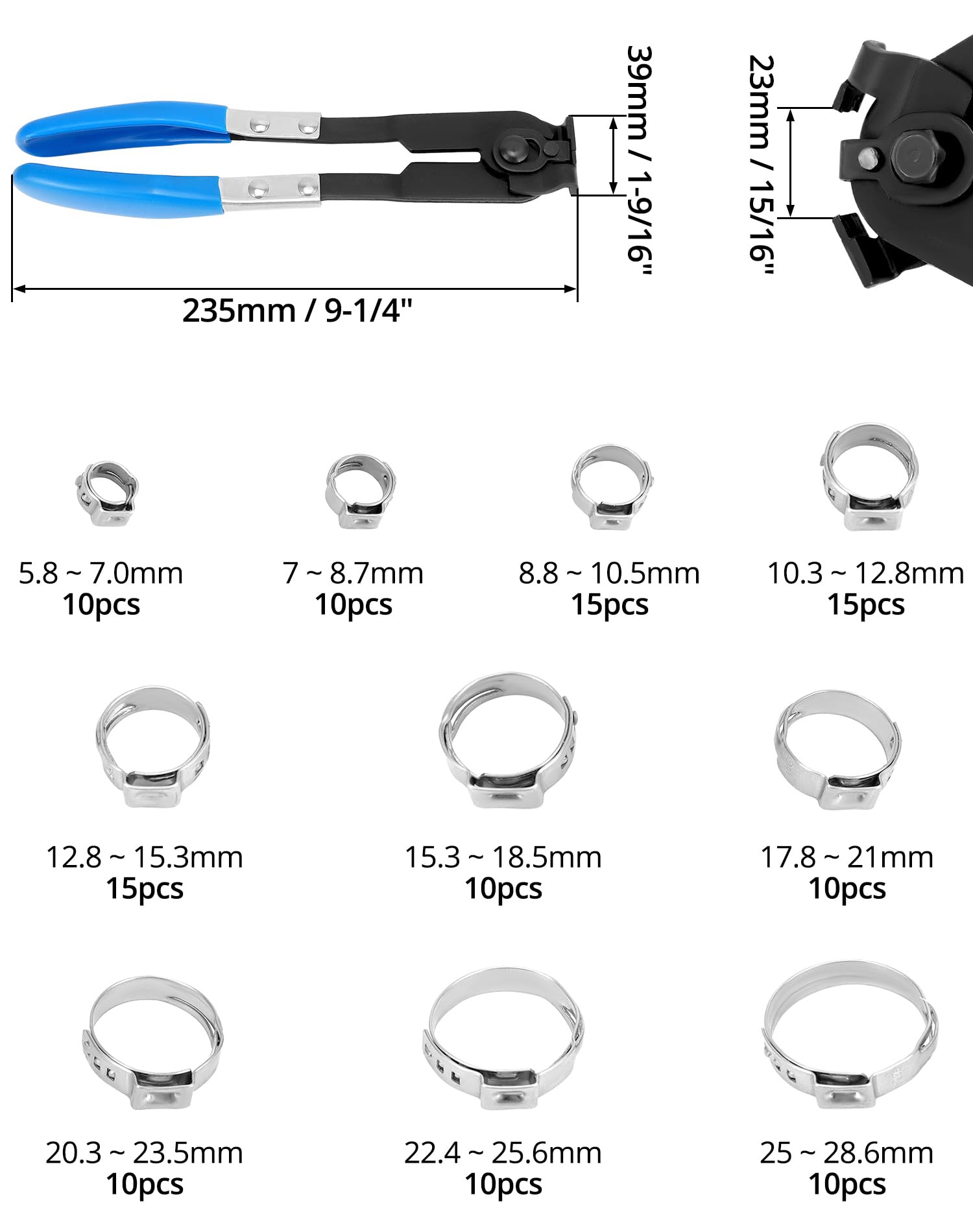 Fabriqués en acier inoxydable 304 de qualité supérieure, ces colliers de serrage offrent un maintien ferme à 360° et garantissent que vos tuyaux restent fermement en place., 2., Notre jeu de colliers de serrage offre un large choix de tailles pour différents diamètres de tuyau et garantit ainsi toujours un ajustement parfait., 3., Avec ses propriétés résistantes à la corrosion et à la rouille, vous pouvez compter sur une longue durée de vie. Avec notre jeu de 116 colliers de serrage avec pince, vous avez toutes les tailles dont vous avez besoin pour chaque travail. Ne devinez plus jamais la bonne taille. 115 Pièces Colliers Serrage Inox 6-28.6mm, Assortiment de Caractéristiques : Matériau : acier inoxydable 304., Dimensions : 6-28,6 mm , Quantité : 115 pièces., Caractéristiques : 1., Kit de colliers de serrage d'oreille – la solution ultime pour des connexions sûres et sans fuite. Dites bonjour pour un entretien rapide et facile Lot de 115 colliers de serrage à tube unique en continu avec pince et acier inoxydable 304 - 6... Découvrez la puissance de la tension à 360° avec nos colliers de serrage d'oreille. Dites adieu aux fuites de tuyaux avec nos colliers de serrage en acier inoxydable 304., Ne vous inquiétez plus de la corrosion ou de la rouille, ces colliers de serrage sont conçus pour une longue durée de vie Ne vous souciez plus de desserrer et d'installer des colliers de serrage. Les dimensions sont gravées sur nos colliers d'oreille pour vous faciliter la tâche. Points clés du produit : **Matériau en galvanisation colorée** : Fabriqué à partir de zinc coloré, ce collier de serrage est durable et a une longue durée de vie. **Spécifications variées** : Disponible en différentes tailles, ce collier de serrage est adapté pour divers types de tuyaux. **115 pièces incluses** : Le kit contient 115 colliers de serrage pour tuyaux, faciles à... Extérieur Lot De 115 Colliers De Serrage à Tube Unique En Continu Avec Pince Et Acier Inoxydable 304 - 6 Collier De Serrage Ne vous contentez pas de moins lorsqu'il s'agit de fixer vos tuyaux - Faites confiance à la fiabilité et à la durabilité de nos colliers de serrage à oreille unique.