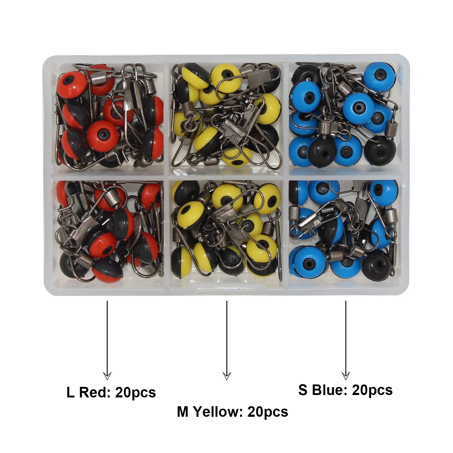 Quantité : taille L : (36 mm ~ rouge), 30 pièces, taille M : (32 mm ~ jaune), 30 pièces, taille S : (28 mm ~ bleu), 40 pièces, et 100 pièces au total. Emballage: boîte tout-en-un Multi-usage et idéal pour la pêche. 3 Größen: L (36 mm ~ rot), M (32 mm ~ gelb), S (28 mm ~ blau). Menge: 20 Stück/Größe, insgesamt 60 Stück. Verpackung: transparente PP-Kunststoffbox in einem. Metall und Kunststoff Vielseitig einsetzbar und ideal zum Angeln OKVGO 60 Stück Angelzubehör Running Ledger Slider Beads Snap