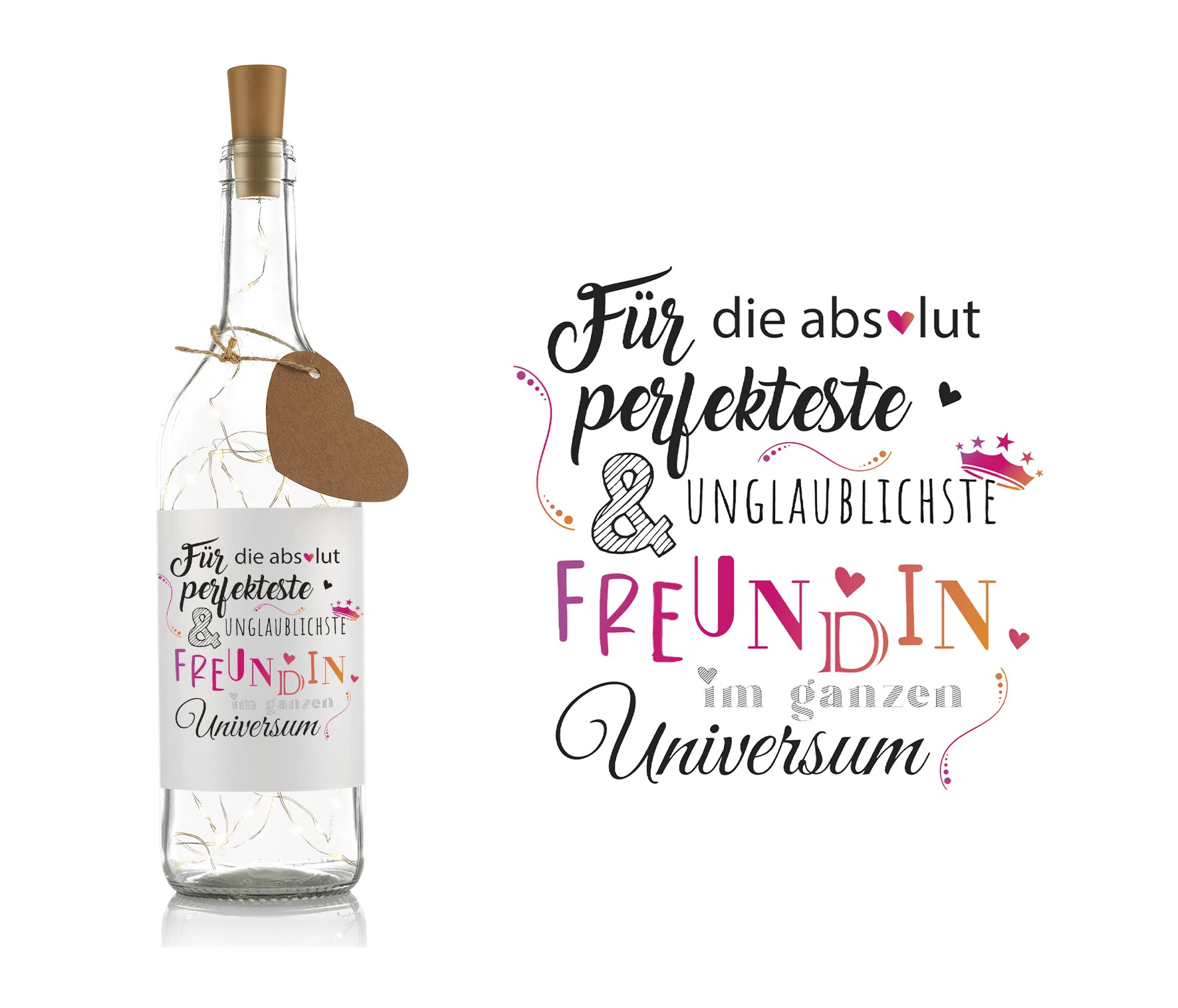Vous trouverez de nombreux autres cadeaux pour toutes les occasions dans notre boutique Amazon ❤️Photophore pour bouteille avec inscription « Pour la meilleure amie dans tout l'univers ». Convient également comme cadeau d'argent. ❤️Que ce soit pour la Saint-Valentin, un anniversaire, Noël, la fête des mères, la fête des pères ou comme cadeau d'amitié pour dire simplement merci à vos proches préférés. Lampe avec bouteille en verre préférée La pile bouton est facile à remplacer. Découvrez notre coloriage pour la meilleure amie de la vie, idéal pour célébrer l ? Que ce soit pour la Saint-Valentin, un anniversaire, Noël, la fête des mères, la fête des pères ou même comme cadeau d'amitié pour dire merci à votre personne préférée. Bouteille de vin de 750 ml., Corde de jute., Banderole imprimée. ❤️La guirlande lumineuse LED peut être allumée et éteinte sur le bouchon de la bouteille. Cette bouteille en verre rose s'illumine de lumières LED en forme d'étoiles et porte un joli message : 'Les amis sont comme les étoiles...'. Parfaite pour un... ❤️ Conçu, imprimé et fabriqué en Allemagne. Décoration de la maison: cette lampe de bouteille pour petite amie peut non seulement être utilisée comme décoration de la maison, mais peut également être placée à côté du lit comme lampe à éclairage chaleureux; C'est aussi une belle œuvre d'art décorative; Il s'intègre facilement à votre décoration intérieure et donne à... La lumière de bouteille est adaptée à toutes les occasions. Bouteille de vin de 750 ml., Ficelle de jute., Banderole imprimée. Pour ce faire, les billets peuvent être facilement fixés à la ficelle nouée. Cadeau Amie,Meilleure Amie Cadeau,Cadeau Amie Femme,Cadeau Meilleure Amie, Cadeau Femme Anniversaire,Led Veilleuse Gravée Lamp - Maison La lampe bouteille est adaptée à toutes les occasions.