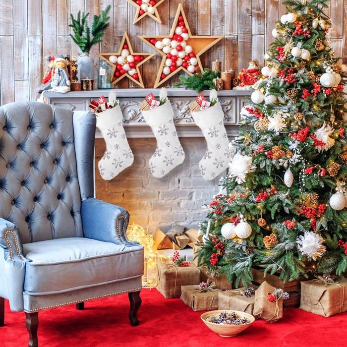 Chaussettes de Noël pour adulte Chaussette de Noël (H45 cm) Fourrure et pompons ; Couleur : blanc cassé. ; Dimensions : - Hauteur de la chaussette : 45 cm. - Longueur du pied : 25 cm. ; Matière... Lot De 4 Chaussettes De Noël Avec Flocon De Neige, Père Noël, Bonhomme DOITOOOL Chaussette de Noël avec fausse fourrure blanche scintillante... Idéales pour être garnies de cadeaux, pour la décoration saisonnière et pour les traditions familiales, ces chaussettes festives allient la chaleur rustique au style moderne pour des décorations de Noël joyeuses et un confort hivernal au quotidien.
