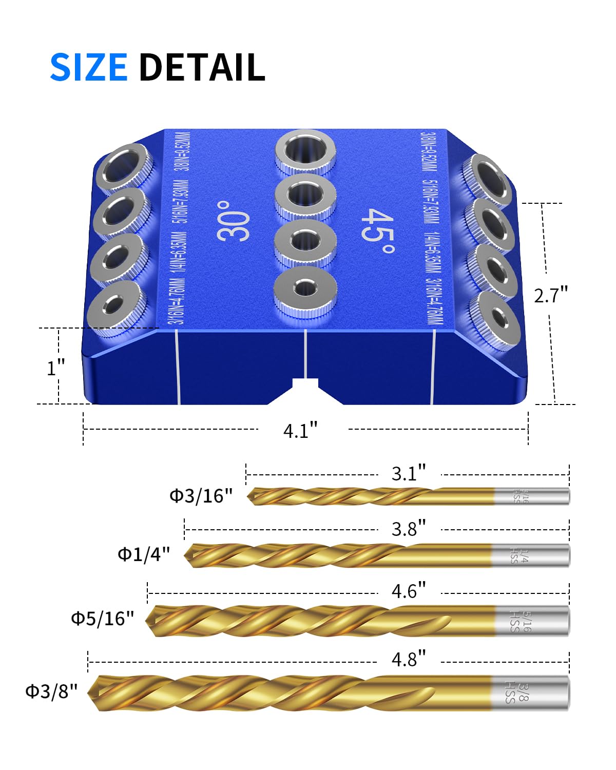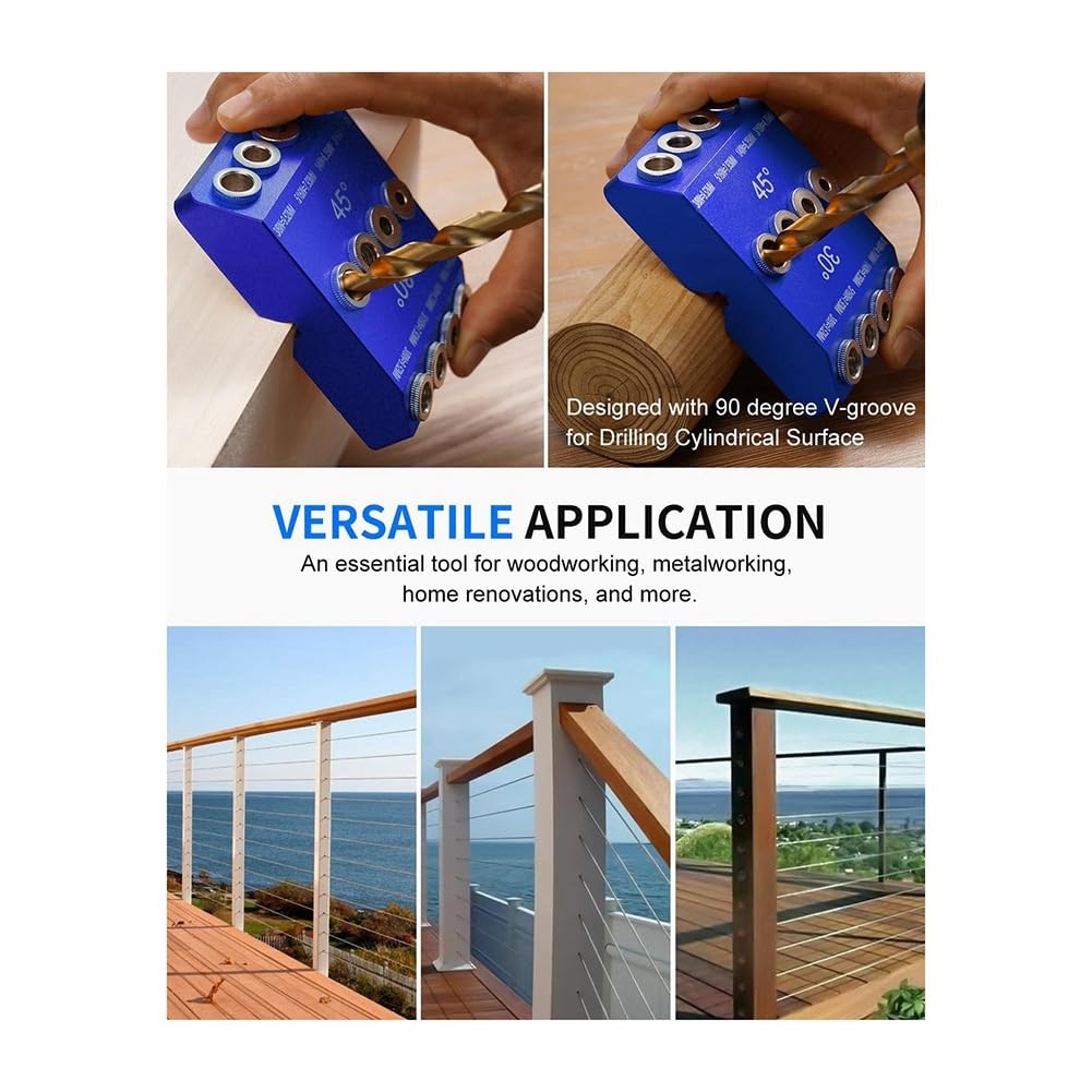 Yuikome Couleur : bleu. Les guides de perçage sont disponibles en angles de perçage de 30 degrés, 45 degrés et 90 degrés. Seul le contenu de l'emballage ci-dessus, les autres produits ne sont pas inclus. Les guides de perçage sont disponibles avec des angles de perçage de 30 degrés, 45 degrés et 90 degrés. Convient aux poteaux de pont horizontaux à 90 degrés et aux rampes d'escalier à angle de 45 degrés et 30 degrés, l'angle est fixé sans déviation Avec quatre tailles de trous de guidage de perçage pour chaque angle, 3/8 pouces (9,52 mm), 5/16 pouces (7,93 mm), 1/4 pouces (6,35... Gabarit de perçage pour trous inclinés, 15 degrés, avec adaptateur pour... Pcivzxam Gabarit De Guidage De Perçage D'Angle 30 45 90 Degrés, Gabarit De Perçage Pour Trous Coudés Et Trous Droits Avec 4 Tailles De Forets En Contenu de l'emballage : 1 guide de perçage., 4 x forets. Gabarit de guidage de perçage polyvalent pour localisateur de trous coudés droits, Kit de perçage pour pont de garde-corps de câble, câble horizontal, poteau en bois Un guide de perçage incliné efficace et compact qui est facile à transporter. Remarque : la couleur réelle de l'article peut être légèrement différente de celle de la photo en fonction des paramètres d'affichage et de luminosité de votre ordinateur. Ce guide de perçage pour perceuses d'angle peut être utilisé avec le verrouillage C- et F- pour éviter que la perceuse ne vacille pendant le perçage et permettre de percer des trous sans bavure et sans fissures.