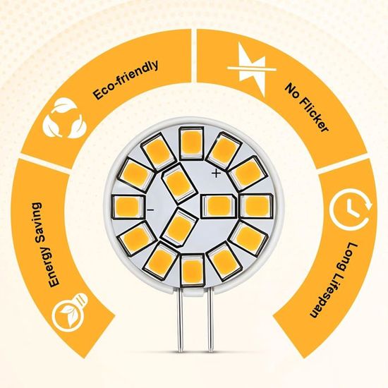 18 SMD montées sur un côté du disque, elles fournissent un éclairage direct à un angle de 120° sans perte de lumière Ampoule G4 Lamptobe LED 2W, Équivalent Ampoule Halogène 20W, AC/DC Ampoule Halogene G4 Notre LED G4 12V présente un indice de rendu des couleurs (IRC) élevé de plus de 80 Ra, garantissant des couleurs vives et réalistes Ampoule G4 LED 2W,Équivalent Ampoule Halogène 20W,AC/DC 12V,220LM,Blanc Chaud 2700K,18 * 2835 SMD,G4 Ampoule Ronde LED pour Lumière ... -15€ dès 129€ d'achat... Pour des performances optimales, nous recommandons l'utilisation d'un transformateur compatible avec les LED Money Back Guarantee ensures that buyers receive the item they ordered or get their money back. Ampoule LED G4 Backpin Plat SMD 5050 2W 170lm (25W) 150° - Blanc Neutre Note pour les Ampoule LED G4 12V: Si vous constatez un scintillement avec un transformateur halogène, essayez d'ajouter 1 à 3 ampoules halogènes dans l'assemblage d'ampoules LED G4 pour éviter le scintillement dû à la faible consommation d'énergie des LED. IRC élevé: Illuminez avec une précision des couleurs exceptionnelle.