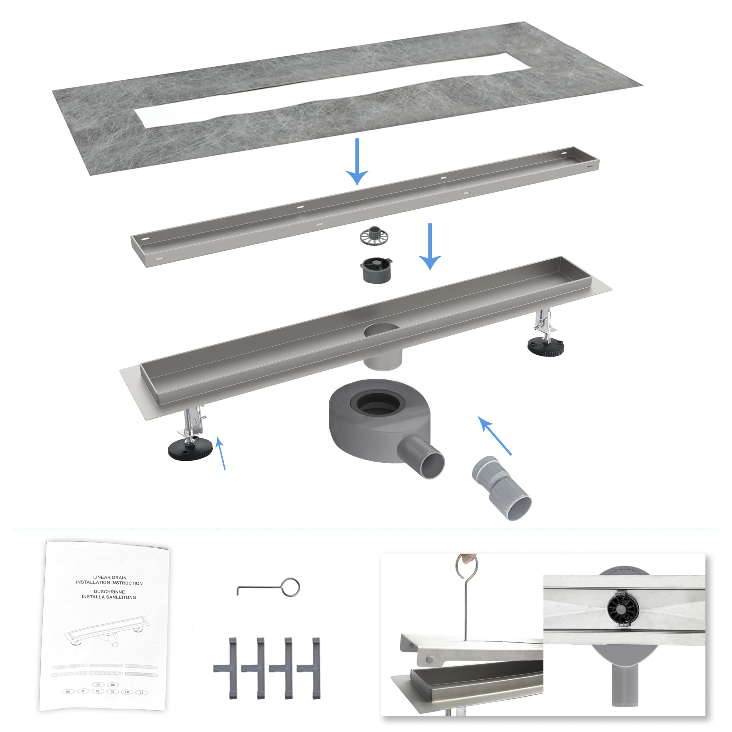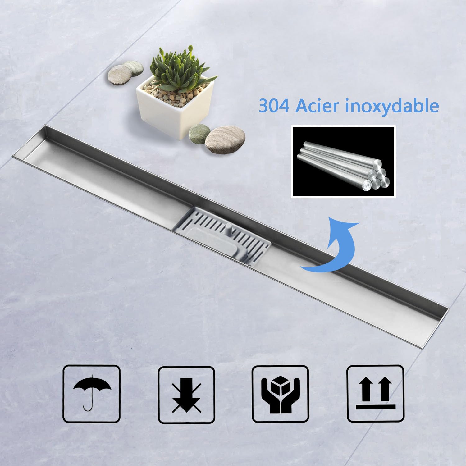 Caniveau Avec Siphon Caniveau De Douche Presto Italia Avec Siphon Pour Handicapés PD150 évacuation De Douche Castorama Apportez des possibilités illimitées pour la conception de votre salle de bain. Accessoires de Salle de douche Drain de Plancher Douvres Pied Contrôlé Drain de Pieds réglabls Susceptibles d’ajuster la hauteur de 90mm à150mm pour différentes scènes. Le drain de douche linéaire VEVOR offre un drainage rapide, une prévention des obstructions et une installation facile des carreaux avec de l'acier inoxydable de haute qualité et tous les accessoires nécessaires. En particulier, le soudage du siphon le rend plus résistant à la déformation et à la corrosion, garantissant que le caniveau de douche ne fuira pas. Aperçus: Avec les styles variés, les caniveaux de douche d’ Acezanble disposent d' une haute qualité et d'un design moderne. Écoulement de drainage 35L / min, ce qui peut résoudre le problème d'accumulation d'eau dans la plupart des situations de douche. Matériau et technologie La gouttière et le panneau sont fabriqués à 100% en acier inoxydable AISI304, qui est solide, durable et a une longue durée de vie. 【Installation】 Le caniveau de douche est fourni avec différentes longueurs et est équipé de pieds de réglage réglables en hauteur La hauteur d'installation du siphon de sol peut être ajustée selon vos besoins. Accessoires d’emballage 1x Caniveau de douche , 2x Pieds réglables , 1x Grille 【Artisanat】 La gouttière et le panneau sont fabriqués à 100% en acier inoxydable AISI304, qui est solide, durable et a une longue durée de vie. Siphon d'anti-odeur en plastique dur Susceptible d’empêcher le refoulement des eaux usées et des odeurs, de protéger contre les insectes et de maintenir l'hygiène de la salle de bain. Le siphon intégré à 360° bloque les mauvaises odeurs, et le filretient les cheveux pour éviter les bouchons. Idéal pour une rénovation ou une installation neuve... Il peut être assorti à tous les styles de salle de bain, en particulier les douches à l'italienne. Filtre amovible Capable de recueillir efficacement les cheveux et les impuretés évitant le bouchage. Ils peuvent être assorti à tous les styles de salle de bain, partilucilièrement les douches à l'italienne, qui créent les possibiltés illimitées pour la conception de votre salle de bain. Le crochet attaché peut retirer le panneau, le filtre et le siphon pour le nettoyage. Art] Caniveau de douche rectangulaire de siphons de sol combine un savoir-faire de haute qualité, un design moderne et des styles traditionnels. Il peut être assorti à tous les styles de salle de bain, en particulier les douches à l'italienne Le siphon intégré peut bloquer toute odeur et isoler les bactéries. 1x Notice et le manuel d'installation