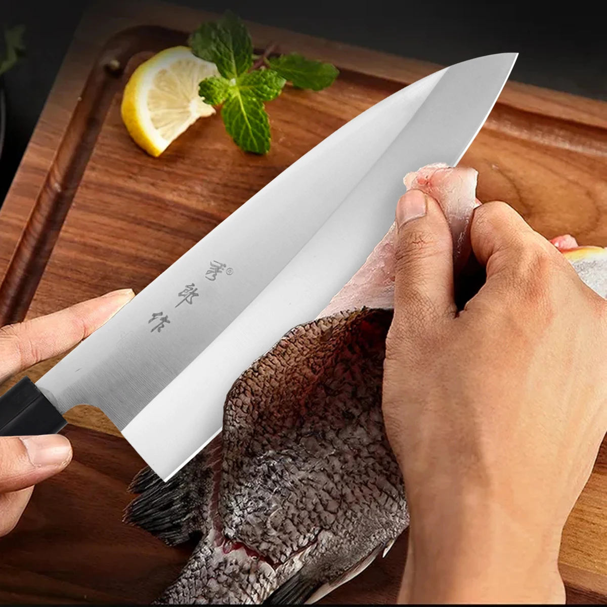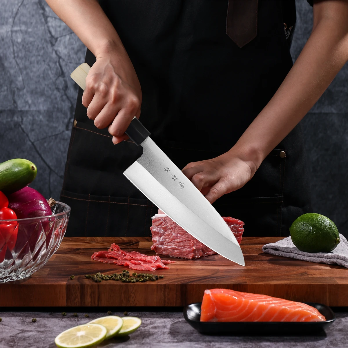 Professionnel : grâce à son affûtage exceptionnel, il est parmi les meilleurs couteaux de cuisine professionnels japonais. Le couteau est contenu dans une boîte en carton à fermeture magnétique, parfaite pour ranger votre couteau et/ou faire plaisir. Fabriqué avec une attention particulière à l'hygiène. Couteaux de cuisine japonais. Poignée ergonomique au confort assuré., Meilleure installation. La lame a été forgée avec un seul type d'acier et est fine et tranchante d'un seul côté, hautement polie pour réduire tout embrayage et effort lors de la coupe. Dimensions : longueur totale de 42 cm : 27 cm lame et 15 cm manche ; largeur de la lame : 3,5 cm ; épaisseur de la lame : 3,8 mm ; poids du couteau : 256 g. Couteau à Sashimi lame en acier de damas 20 cm manche décoré Manche en bois traité pour une utilisation en cuisine. Avec nos couteaux de cuisine professionnels, chaque cuisinier peut transmettre de manière inconditionnelle son amour pour la nourriture, avec une coupe parfaite qui met également en valeur les ingrédients les plus simples pour créer des plats esthétiques et sans gaspillage de matières premières. Un couteau de cuisine professionnel un couteau planté dans du bois... Les plus de Totiko : Design et soin apporté aux détails. Le couteau japonais, un savoir-faire millénaire Yanagba conçu pour le nettoyage du poisson et la préparation de sushis et sashimi Couteau professionnel japonais. Utilisation pratique pour chaque préparation , Coupe précise , Affûtage durable. Comment ? Tout simplement en combinant cette passion à des siècles d'histoire japonaise dans la fabrication de couteaux artisanaux, de matériaux précieux, de style italien ? Une touche de technologie ! Il est également pratique, facile à utiliser et à entretenir. Haute qualité : TOTIKO JAPAN KNIVES est né depuis des années de passion pour la cuisine, les aciers et l'envie de toujours surpasser. Caractéristiques de la lame : couteau professionnel japonais avec lame de 27 cm en acier à haute teneur en carbone avec une dureté de 58 HRC. La lame est durable et maintient longtemps le fil. Téléchargez cette photo Premium sur Un couteau de cuisine professionnel un couteau planté dans du bois et explorez des millions de photos professionnelles sur Freepik. Couteau De Cuisine Japonais Kaitsuko Cassary Set De Couteaux De Cuisine Professionnel En Acier Damas Avec Huusk Japan Caractéristiques du manche : le manche en bois traité pour son dans la cuisine a été réalisé avec une attention particulière à l'hygiène, en outre, il possède une poignée extrêmement ergonomique et rend le couteau léger et maniable. Léger et maniable, manche ergonomique, coupe précise et fine, nettoyage facile.