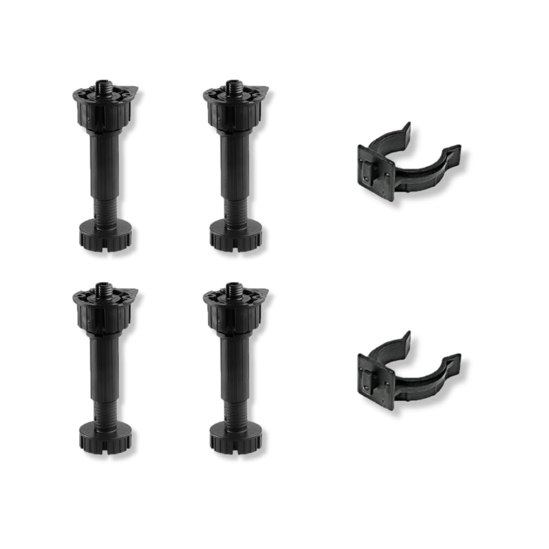 Pied De Meuble Reglable Lot De 4 Pieds De Meubles Réglables En Plastique Pour Cuisine Ou Salle De Bain, Accessoires De Rechange (petite Carte De 15 Cm Pied De Meuble 10cm Ce type de plastique rend le pied très rigide, plus durable dans le temps, résistant à la corrosion et imperméable, idéal donc pour être utilisé sous les meubles de cuisine ou de salle de bain. Composition de l'emballage : chaque paquet contient le même nombre de clips de montage que les pieds et 4 vis autotaraudeuses de fixation pour chaque pied Avertissement De Sûreté Prenez soin de ne pas dépasser la limite de poids, d'assurer une installation stable et de faire attention aux parties mobiles lors de l'installation. Joint pour plinthe cuisine, profil d’étanchéité pour socle cuisine... Excellente qualité : les pieds réglables sont fabriqués en plastique ABS de haute qualité. Ce type de plastique rend le pied très rigide, plus durable dans le temps, résistant à la corrosion et imperméable, idéal donc pour être utilisé sous les meubles de cuisine ou de salle de bain. Lot de 4 pieds réglables noirs pour socle de cuisine - pieds... Matériaux de qualité : les pieds en plastique et en métal sont fabriqués avec des matériaux de haute qualité, garantissant résistance, durabilité et stabilité dans le temps 4x Pied réglable 150 mm, modèle à visser (4 pièces) - Pieds réglables réglables de Idéal pour les meubles de cuisine : ces pieds réglables sont spécialement conçus pour les meubles de cuisine, offrant une solution pratique et fonctionnelle pour garder vos meubles soulevés par le sol et faciliter le nettoyage sous les meubles Pieds réglables : les pieds sont équipés d'un système réglable qui permet une variation de la hauteur de 2 cm, offrant une flexibilité pour obtenir la hauteur désirée pour vos meubles de cuisine Différentes options : disponible en deux matériaux (plastique ou métal) et trois hauteurs différentes (10 cm, 12 cm, 15 cm), offrant une variété de choix pour s'adapter aux besoins spécifiques de votre cuisine Pied métallique pour table en acier noir.Pied métal plat.Platine 3 trous.Profondeur 50 mm. 3 hauteurs de pieds différents sont disponibles : 10 cm réglable jusqu'à 12, 12 cm réglable jusqu'à 14 et 15 cm réglable jusqu'à 17., Où les appliquer : les pieds réglables sont adaptés à des endroits tels que la cuisine, la salle de bain, la chaudière, les chambres à coucher et les placards.