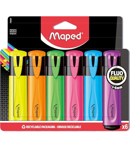 ✅ Design ergonomique : la forme crayon de nos surligneurs favorise une utilisation beaucoup plus confortable que les surligneurs classiques. Conçus dans un souci de confort et de polyvalence, ces surligneurs sont l'outil parfait pour les étudiants, les adversaires, les enseignants et les employés de bureau qui ont besoin de souligner régulièrement. Fluo Pastel Lot De 12 Surligneurs De Couleurs Assorties Pastel Avec Pointe Biseautée Douce, Séchage Rapide Marqueur Fluo Avec une pointe biseautée offrant un trait réglable entre 1 mm et 4 mm, nos surligneurs vous permettent de jouer avec l'épaisseur du trait pour créer une présentation visuellement attrayante dans vos documents. En plus de souligner, nos surligneurs vous permettent également de souligner et de dessiner avec facilité. ✅ Soulignez, démarquez et dessinez : utilisez nos marqueurs marqueurs pour souligner vos notes ou textes, réaliser des invitations d'anniversaire ou des couvertures colorées qui se démarquent grâce à leurs couleurs esthétiques et leur variabilité de trait, et décorez vos documents en réalisant des dessins vifs de manière simple, grâce à sa forme de crayon Sa teinte exacte assure une visibilité optimale sans compromettre la lisibilité du texte souligné, offrant une expérience de mise en évidence inégalée. PACK DE SURLIGNEURS FLUORESCENTS -SCHNEIDER- - Papeterie sarah ✅ Encre de qualité : l'encre de nos marqueurs est pigmentée à l'eau et brillante du début à la fin et tout au long de l'utilisation. En plus d'avoir la teinte exacte pour être hautement visible sans compromettre la lisibilité du texte souligné ✅ Crayons surligneurs : lot de 10 marqueurs fluorescents de couleur fluo et pastel : jaune, vert, bleu, orange, rose, jaune pastel, vert pastel, bleu pastel, violet pastel et rose pastel Le surligneur BIC Marking Flat met en évidence les idées clés à l’aide de 8 couleurs : 4 nuances fluo intenses et 4 nuances pastel, le tout avec une encre à base d’eau à séchage rapide qui ne traverse pas le papier. Ce pack contient 4 surligneurs fluo (jaune, orange, vert et rose) fiables et polyvalents. Ils possèdent une pointe biseautée modulable qui s’incline pour surligner... Achète tes surligneurs STABILO BOSS ORIGINAL à l'unité ou en assortiment chez 🎉ConfettiCampus, le spécialiste de tes révisions | 🏷️Economique ✅Livraison rapide 🎉Pastel Ce qui les rend idéaux pour les personnes qui ont besoin de souligner très régulièrement : étudiants, adversaires, enseignants et employés de bureau Faites de la mise en valeur une expérience agréable et stylisée