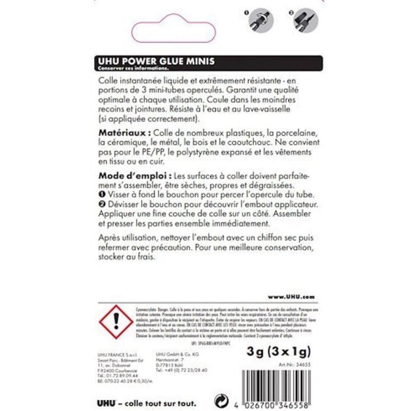 Type: Adhésif instantané, Unités: 3 Unités, Caractéristiques: Extra-fort Adhésif instantané UHU 36527 Minis 3 Unités (1 g) KIND Minis Barres Noix, sel de mer et chocolat noir, 20 g, 10 unités | KIND Glue Gel Adhésif Instantané Bricotech Super Glue Power 3 G | Leroy Merlin Super Glue Gel Adhésif instantané UHU 36527 Minis 3 Unités (1 g) de UHU est vendu sur la boutique awalys dans la catégorie Bricolage et Matériel UHU Tubo que se mantiene de pie de adhesivo extrafuerte y super rápido de 3 gramos, no gotea y... Causes serious eye irritation. Causes skin irritation. Cyanoacrylate. Danger. Bonds skin and eyes in seconds. Keep out of the reach of children. Show 1 more safety warnings