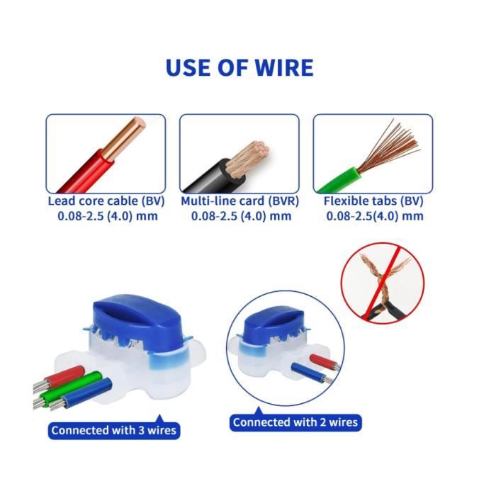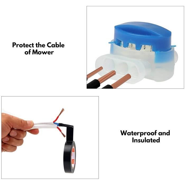 Étapes de l'installation Connecteur Etanche Connecteurs De Câble,Connecteur Electrique Etanche, Connecteur Cable Robot Tondeuse adapté pour 0,5 mm² à 1,5 mm² (22- 14AWG) taille de fil<br/【Largement utilisé】Les connecteurs de fil étanche LE PAQUET EST INCLUS : 20 connecteurs IDC 314-BOX, 5 cosses, 5 connecteurs à déconnexion rapide. LARGE APPLICATION : les connecteurs de fils IDC 314-BOX conviennent aux tondeuses à gazon robotisées, aux clôtures électriques pour chiens, à l'équipement électronique automobile et à l'assemblage de câbles souterrains. MATÉRIAU DE PREMIÈRE QUALITÉ : Le connecteur électrique en queue de cochon est fabriqué en nylon ignifugé, qui est imperméable à l'eau, à l'humidité et anticorrosion, il peut empêcher l'humidité de pénétrer dans la connexion, ce qui garantit des connexions durables et fiables. Ils peuvent résister à des tensions allant jusqu'à 600 V et peuvent connecter 2 ou 3 fils. BOSYTRO 50 Pieces Connecteurs de Câble Remplis des Résines,Connecteur SÉCURITÉ AMÉLIORÉE : Les connecteurs de fils IDC 314-BOX sont dotés de propriétés d'isolation qui offrent une couche de protection supplémentaire, minimisant ainsi le risque de courts-circuits ou de chocs électriques. Adapté au connecteur IDC 314-BOX, veuillez vérifier si ce modèle correspond à vos besoins avant d'acheter. Connecteurs Câble Robot Tondeuse 25 pièces, Colliers Étanches 314 Sertissage, Réparation Câble Périphérique ; i. Livré entre le 03/12 et le 08/12. détails. Vendu... <br/【Haute qualité】 Le connecteur de fil de tondeuse à gazon robot est fabriqué en matériau ABS de haute qualité, avec une coque blanche et un capuchon bleu, la lame de connexion est en cuivre de haute qualité, rempli de gel, étanche et l'humidité. Connecteur de câbles - Phonillico® - Lot de 20 - Étanche - Rempli de gel - Réparation électrique...