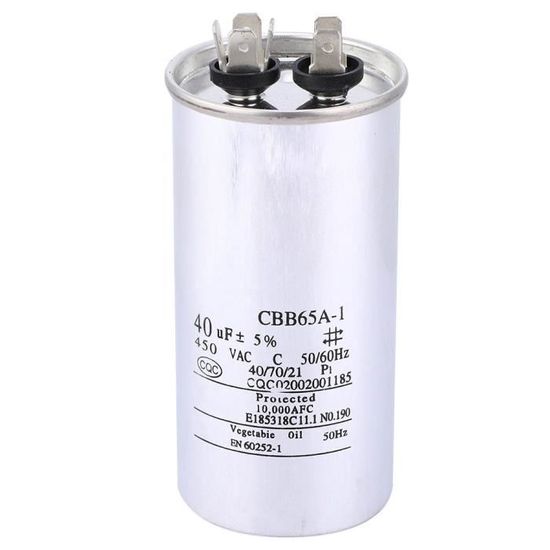 Condensateur de démarrage en aluminium , 40±5% uF, 450V, 50/60Hz Coque en aluminium, non PCB, 10,000 AFC Condensateur 40 uf - Achat / Vente pas cher Condensateur Cbb65 CBB65 Condensateur De Moteur 40 UF 450 V AC 50/60 Hz 40 µF Condensateur Cbb61 6uf 40/85/21 CBB65 Condensateur moteur : 40 µF / 40 µF [Performance de haute qualité]Fréquence : 50/60 Hz, tension nominale : 450 V CA, accessoires : avec prise Boîtier métallique rond : le boîtier en métal durable protège le condensateur contre les influences extérieures telles que l'humidité, la poussière et les dommages mécaniques, ce qui le rend idéal pour une utilisation dans des...