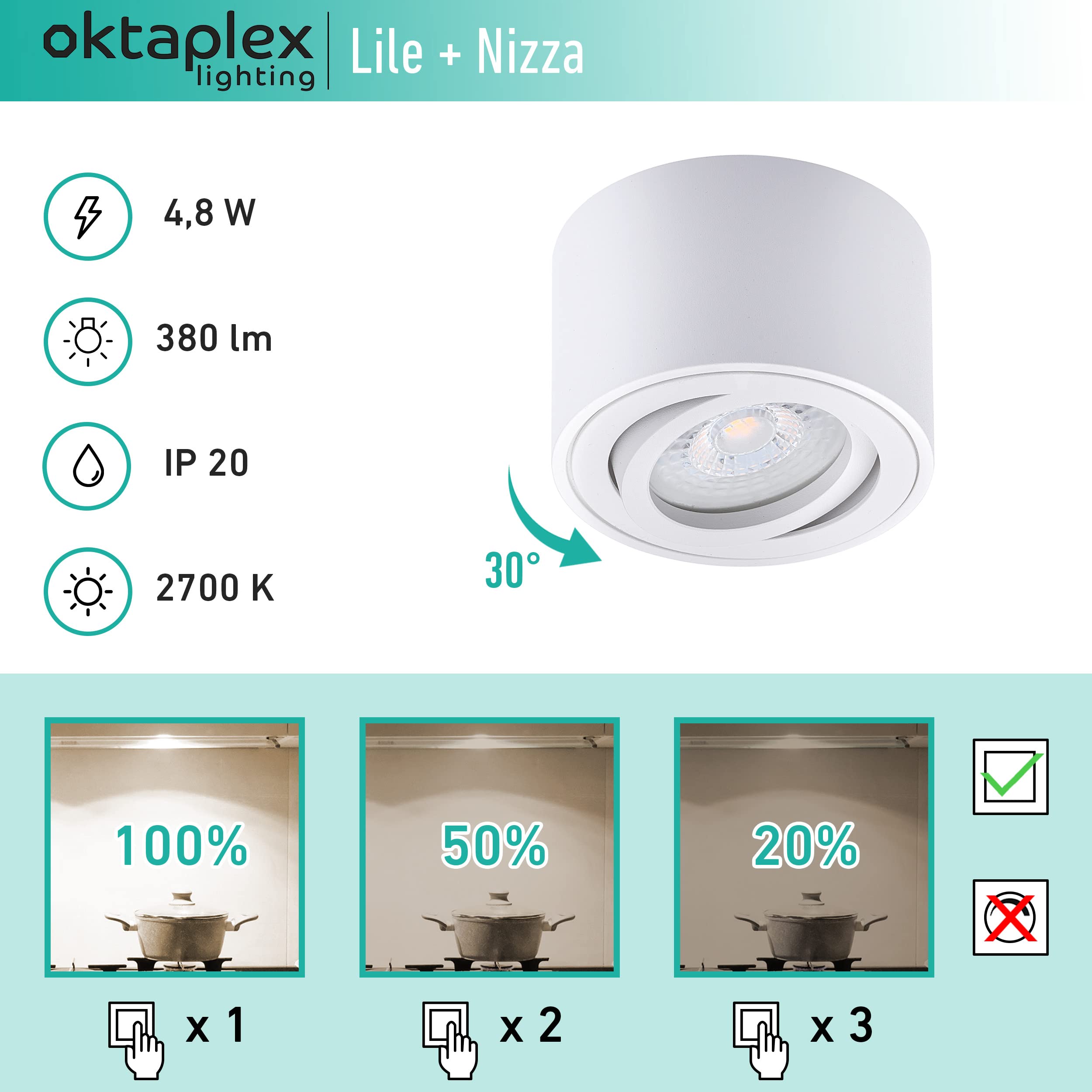 Module LED Nizza - Avec un interrupteur normal, commuter rapidement entre 100%, 50% et 20% de puissance. Design et fonctionnalité réunisLe set Oktaplex Lile M 3 spots en saillie combine design sobre et performance lumineuse. Ces plafonniers LED cylindriques en aluminium blanc s’intègrent facilement dans tout type d’intérieur et apportent une touche moderne aux espaces de vie comme le salon, la salle à manger ou la chambre.Détails techniquesChaque spot est équipé d’un module LED de 5... Raccordement direct à 230V AC. Neon Salle De Bain Oktaplex 3x Dijon Spot Encastrable LED 3 Niveaux Dimmables Orientable Module Nizza 4 8w 2700k 230v 380lm Blanc Chaud 110 Plafonnier Encastre Blanc 96722623 Spot Led Encastrable 68mm Contenu de la livraison : 3 x Lile Spots à poser blancs, 3 x Nizza Modules LED 4,8 W 2700 K à trois niveaux de gradation, matériel de montage Oktaplex 12er Set Aufbauspot Aluminium Lile S für LED-Module Aufputz... OKTAPLEX 3 spot plafond LED dimmable blanc neutre 4000K pivotant - LILE Dimensions : Ø80mm x 50mm de hauteur. 380 lumens, 2700 kelvins, blanc chaud, faisceau large de 110°.