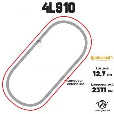 Courroie renforcée kevlar pour tondeuse 4L910 | 4L910 A partir de février 2016, la marque Roulunds Contitech change la couleur de ses courroies. Ne vous étonnez donc pas de recevoir votre courroie Roulunds non pas verte, mais bleu ! C'est le seul changement opéré, la qualité et la fiabilité restant les mêmes ! Fiche technique Fonction de la courroie Traction N° origine courroie 1655069 Largeur 12,7 Longueur extérieure en mm 2311... Courroie Tondeuse 4L370 Continental Kevlar - 12,7 X 7,2 X 940 Mm Modèle 4L910 (12.7x2311 mm), elle remplace la référence 1655069 et convient aux tondeuses autoportées Paget 5116. Le Kevlar offre une résistance supérieure à l... Toutes les courroies tondeuse, motoculture à prix discount avec Matijardin !