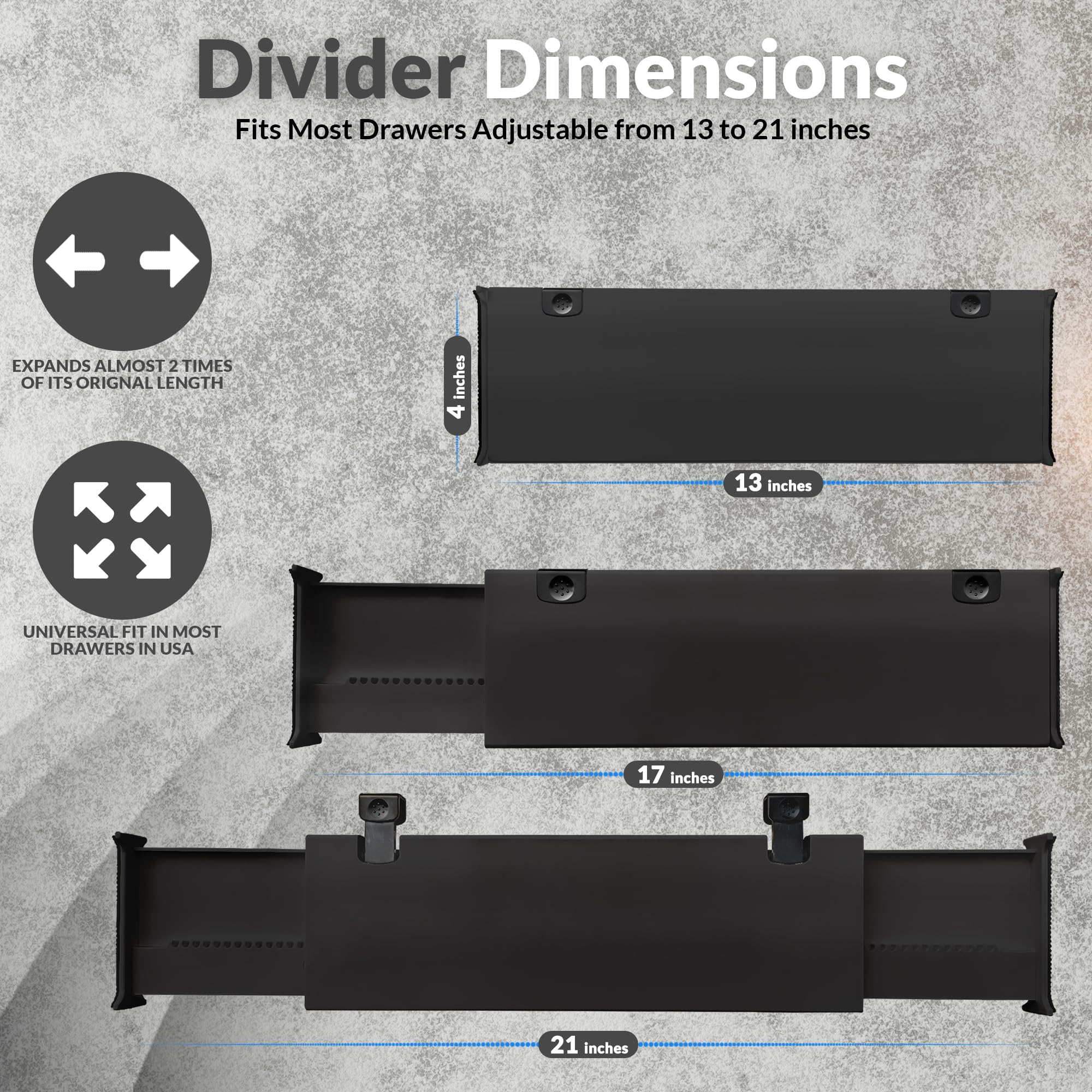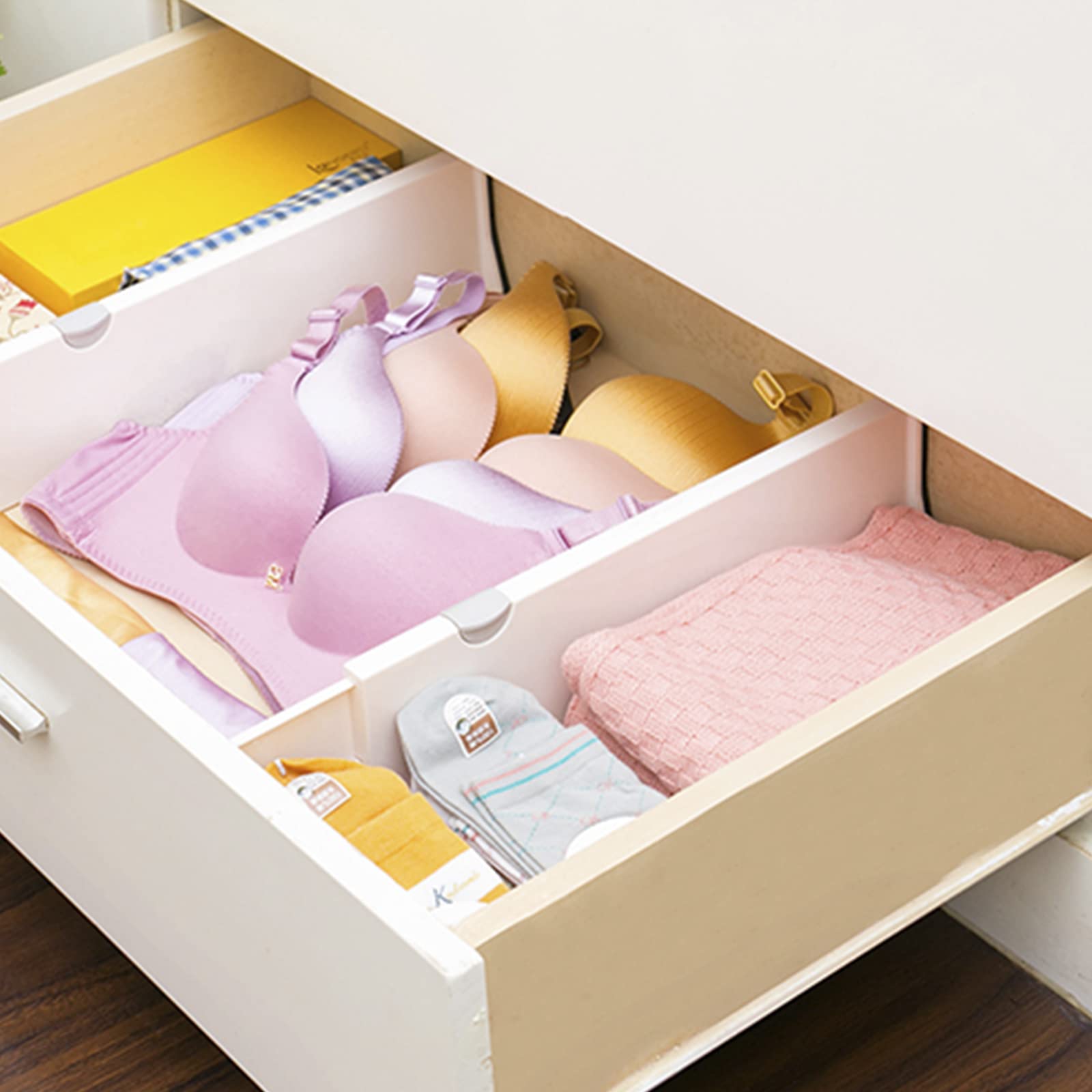Contenu de l'emballage : il y a quatre séparateurs de tiroir extensibles de 33 cm, 43,2 cm et 53,3 cm, fabriqués avec des bords en plastique solide et en mousse, 10,2 cm de hauteur, avec système de verrouillage spécial pour fournir une adhérence maximale et pour trier vos affaires Design extensible : nous avons 4 séparateurs de tiroir, chacun mesure 10,3 cm de haut et 18 à 40 cm de long. (Assurez-vous de mesurer la longueur de votre... BillyBath Separateur tiroirs organisateur, ensemble de 4 séparateurs de tiroir réglables pour Votre partenaire d'organisation complète de la maison : nos séparateurs pour organisateur de tiroir peuvent facilement organiser vos vêtements, essentiels de bureau, commode, maquillage, petits couverts de cuisine, placard, chaussettes, cosmétiques, crèche, soutien-gorge et vêtements de bébé ; rend le tri plus facile et aide à trouver des choses plus rapidement ; dites adieu aux tiroirs désordonnés Separateur De Tiroirs Lot De 4 Séparateurs De Tiroir En Plastique Réglables Et Extensibles De 39,9 Cm à 53,3 Cm Pour Cuisine, Vêtements, Tiroirs Séparateur Tiroir Cdiscount Pour une maison ordonnée, jusqu'au moindre détail Transformez vos tiroirs en véritables espaces de rangement optimisés grâce à nos séparateurs réglables. Parfaits pour organiser vos sous-vêtements, chaussettes, accessoires ou petits objets du quotidien, ils apportent une touche de structure élégante et pratique à votre Élargissez les deux côtés et ajustez selon vos besoins : savez-vous ce qui rend FAHBI différent ? Notre séparateur de tiroir extensible facile à installer « deux façons » peut être étendu presque 2 fois sa longueur d'origine et ajusté aux tailles standard requises aux États-Unis. Choisissez l'une des longueurs de 33 cm, 43,2 cm ou 53,3 cm qui convient à vos tiroirs de rangement