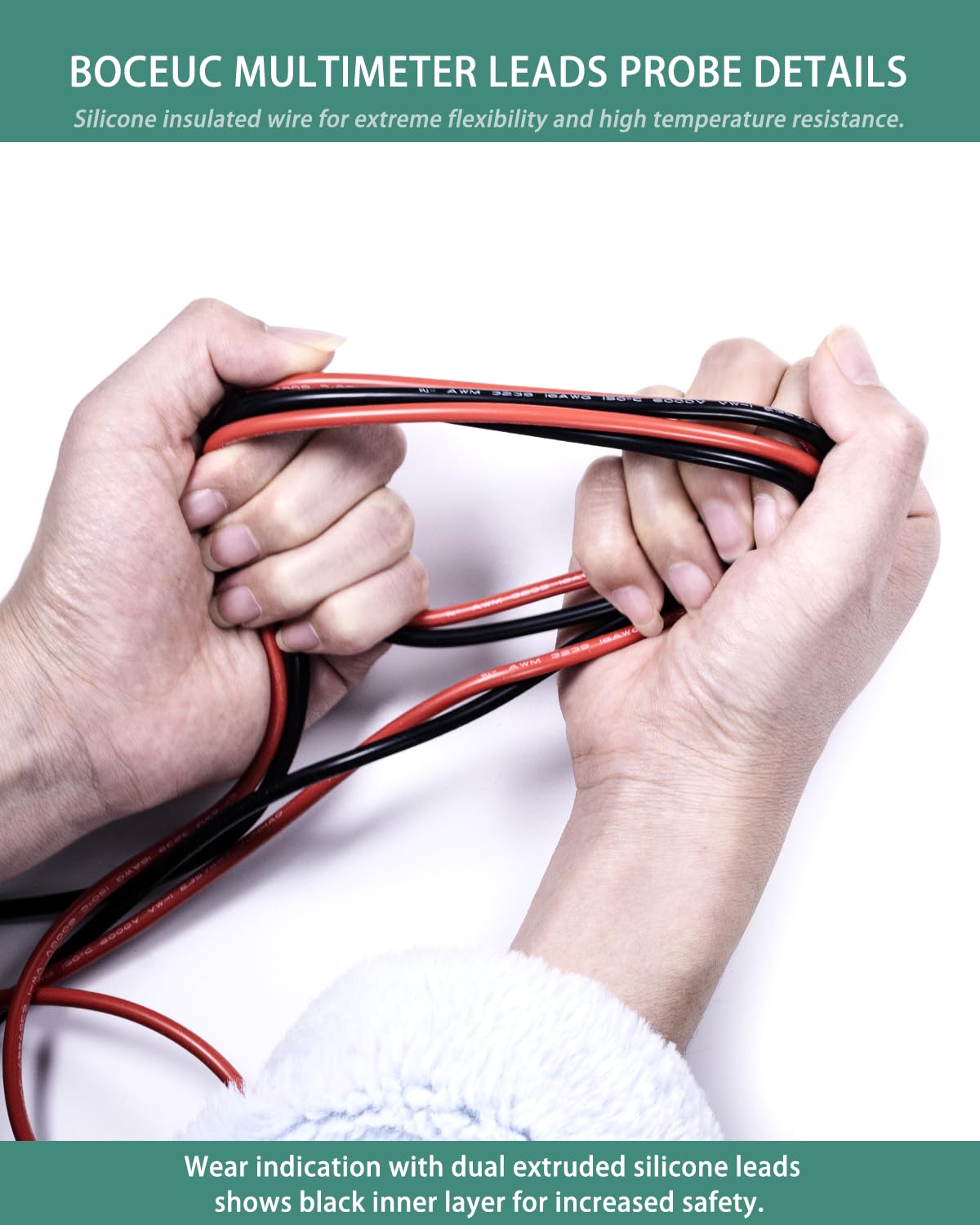 Anti oxydationL'aiguille de test longue et épaisse de cette sonde multimètre a des performances anti oxydation ,une durabilité et une haute précision . Matériau du câble : âme en fil de cuivre solide. Bonne conductivité, un bon choix pour les électriciens., Antioxy Matériau de la broche de test : acier inoxydable. Avec bouchons anti poussièreLes bouchons des broches des fils de test de la sonde sont équipés de bouchons anti poussière pour empêcher la poussière et les corps étrangers d'entrer . Type : Testeur de pointe d'aiguille en fil de silicone. Sondes de Multimètre, Kit de Test en Silicone Souple pour électricien, Cordons de Mesure avec... Description du produit Niveau de sécurité et lourde --- Test de sécurité du courant nominal CAT II 1 000 V, il s'agit d'une fiche droite standard de 4 mm, adaptée à la plupart des multimètres., Matéria Longueur : environ 1,2 m/47,2 pouces. Matériau de haute qualitéLe fil du testeur de pointe d'aiguille est fait de silicone souple résistant aux hautes températures ,qui est flexible ,antigel et résistant à la chaleur . Kit de Sondes de Test Multimètre, Ensemble de Câbles de Test Noyau de cuivre anti effacement ,non durcissant ,anti brûlure ,résistance aux hautes températures ,noyau de cuivre épaissi ,durable . Kit De Sonde De Test Multimètre, Kit De Sonde De Test Multimètre, Multimètre En Silicone Pour Test De Multimètre électrique Numérique Tolérance de température : maximum 200 °C ; Utilisation : multimètre domestique Il peut résister à la tension et aux températures élevées et ne durcira pas en hiver . puchons anti-poussière - -- Les fiches des broches des câbles de mesure de la sonde sont équipées de capuchons anti-poussière pour empêcher la poussière et les corps étrangers de pénétrer. Tbest ensemble de sondes de test électrique numérique Kit de Câble de Test Multimètre... u de haute qualité : le testeur de pointe d'aiguille Le fil est fait de silicone souple à haute température, flexible, résistant au gel et à la chaleur.